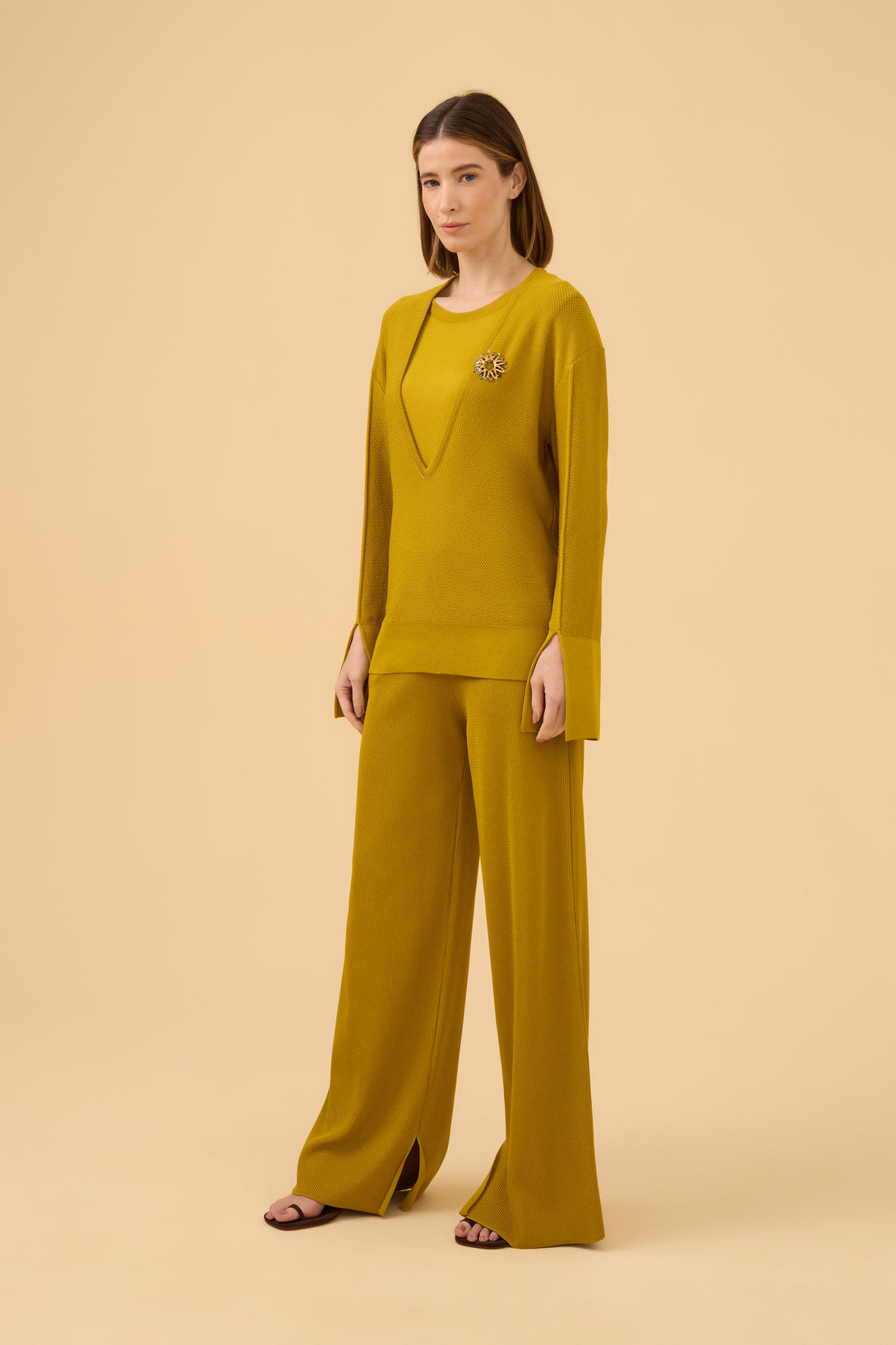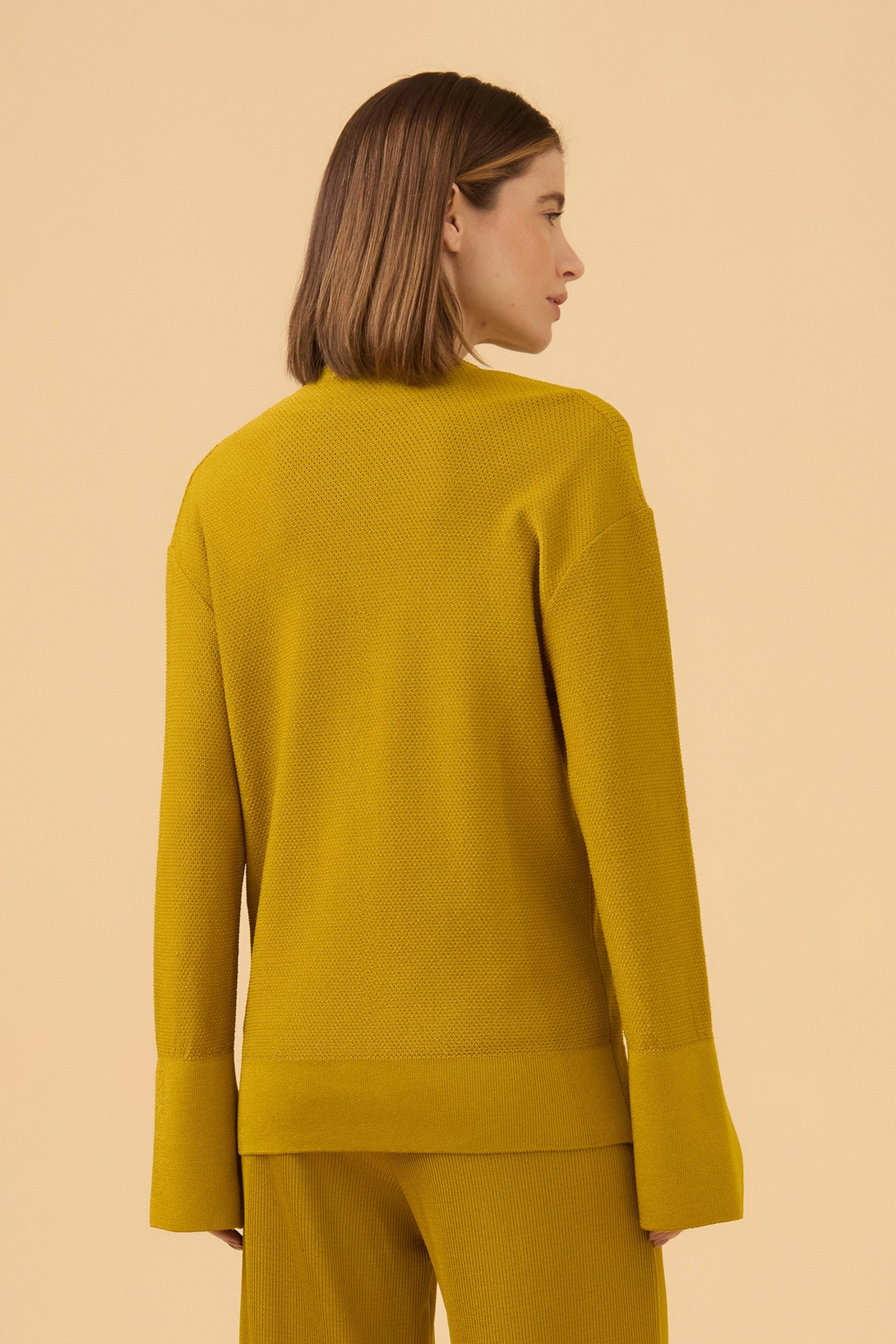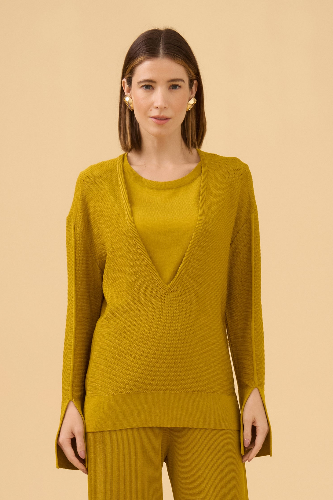 Blusa Ampla Decote V Canelada Em Tricot Azeite