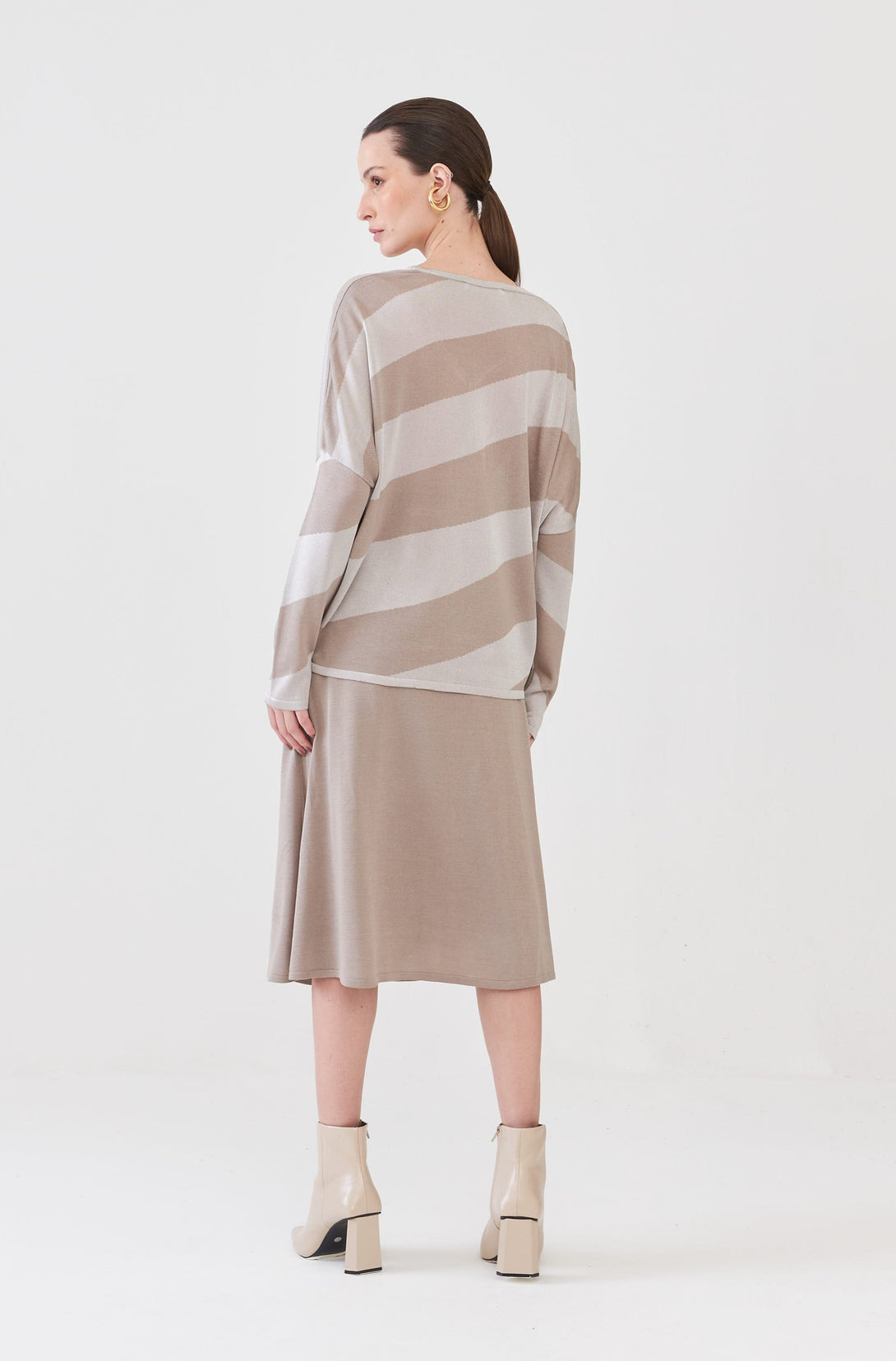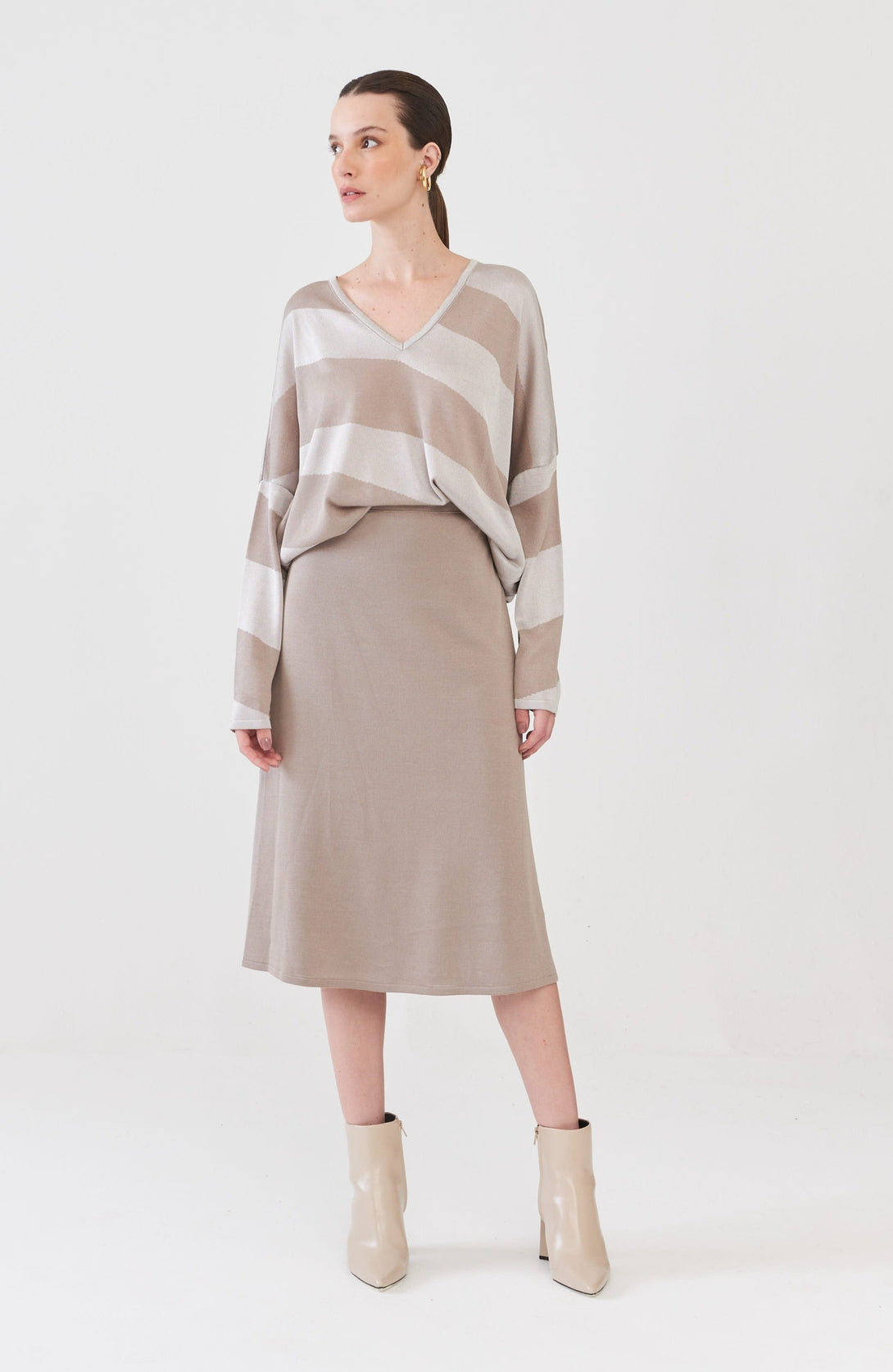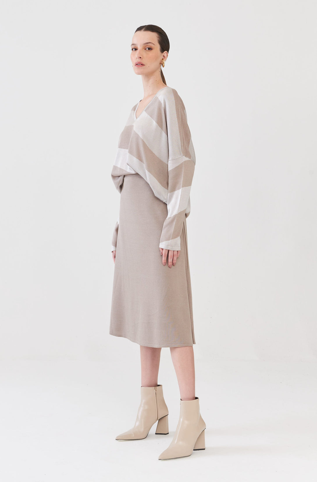 Blusa Alongada Decote V Com Listras Diagonais Listras Poa