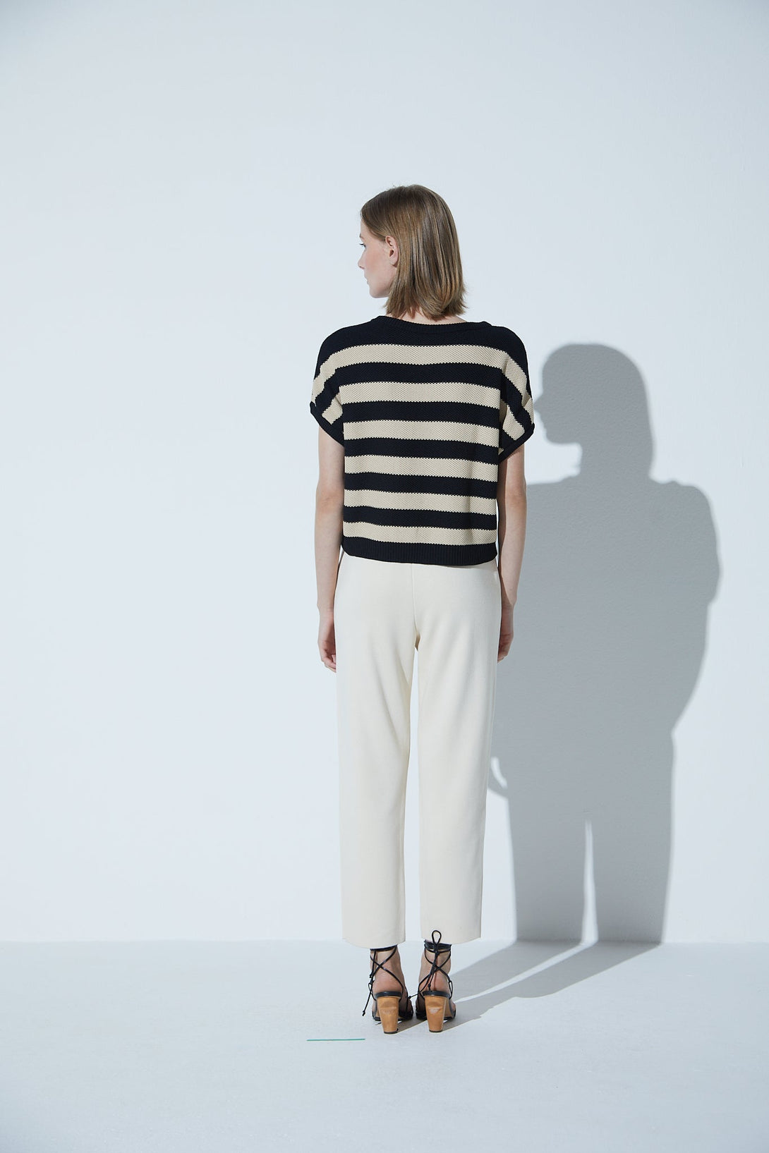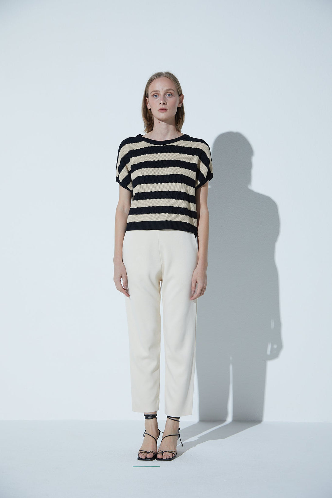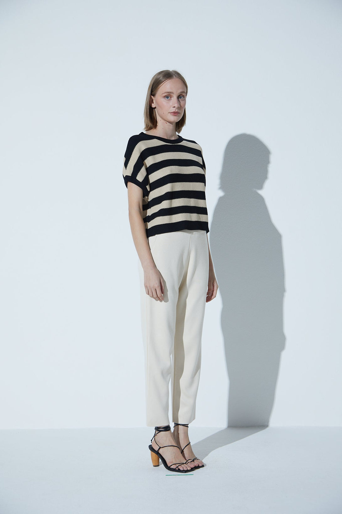 A Blusa Ampla Listras Em Tricot é uma peça versátil e atemporal. Feita em tricot, ela possui gola canoa, listras horizontais, tornando-a casual e descomplicada, ideal para looks do dia-a-dia. Invista!