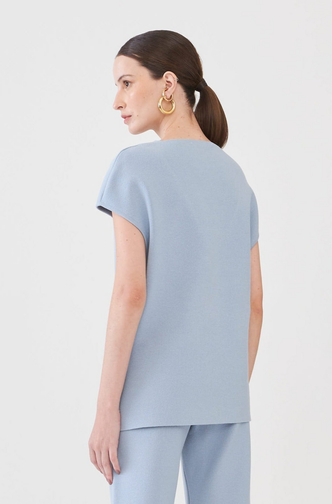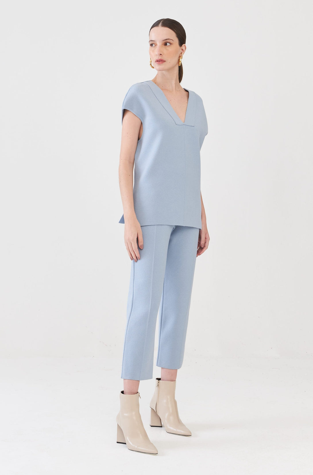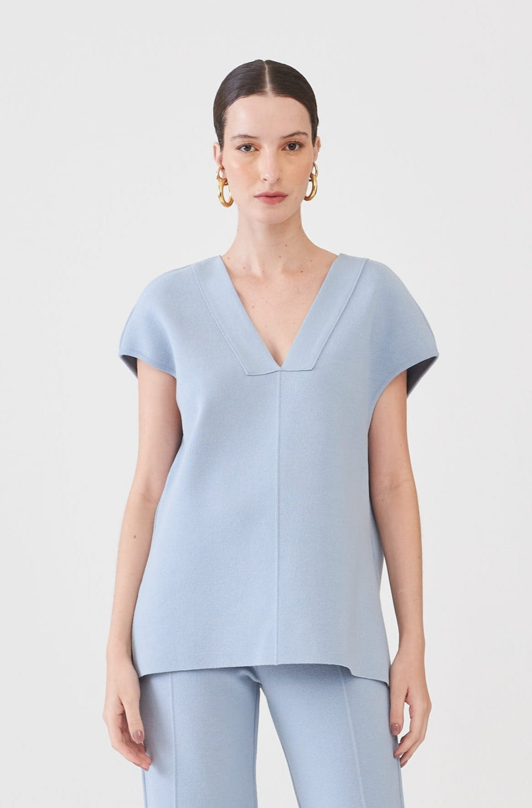 Esta blusa possui um corte amplo e sem mangas, com decote em V que valoriza o colo. Feita em tricot com elastano em sua composição, possui um caimento estruturado e é perfeita para compor um visual easy chic ou usá-la como sobreposição com camisas, é perfeita para os dias de temperatura amena.