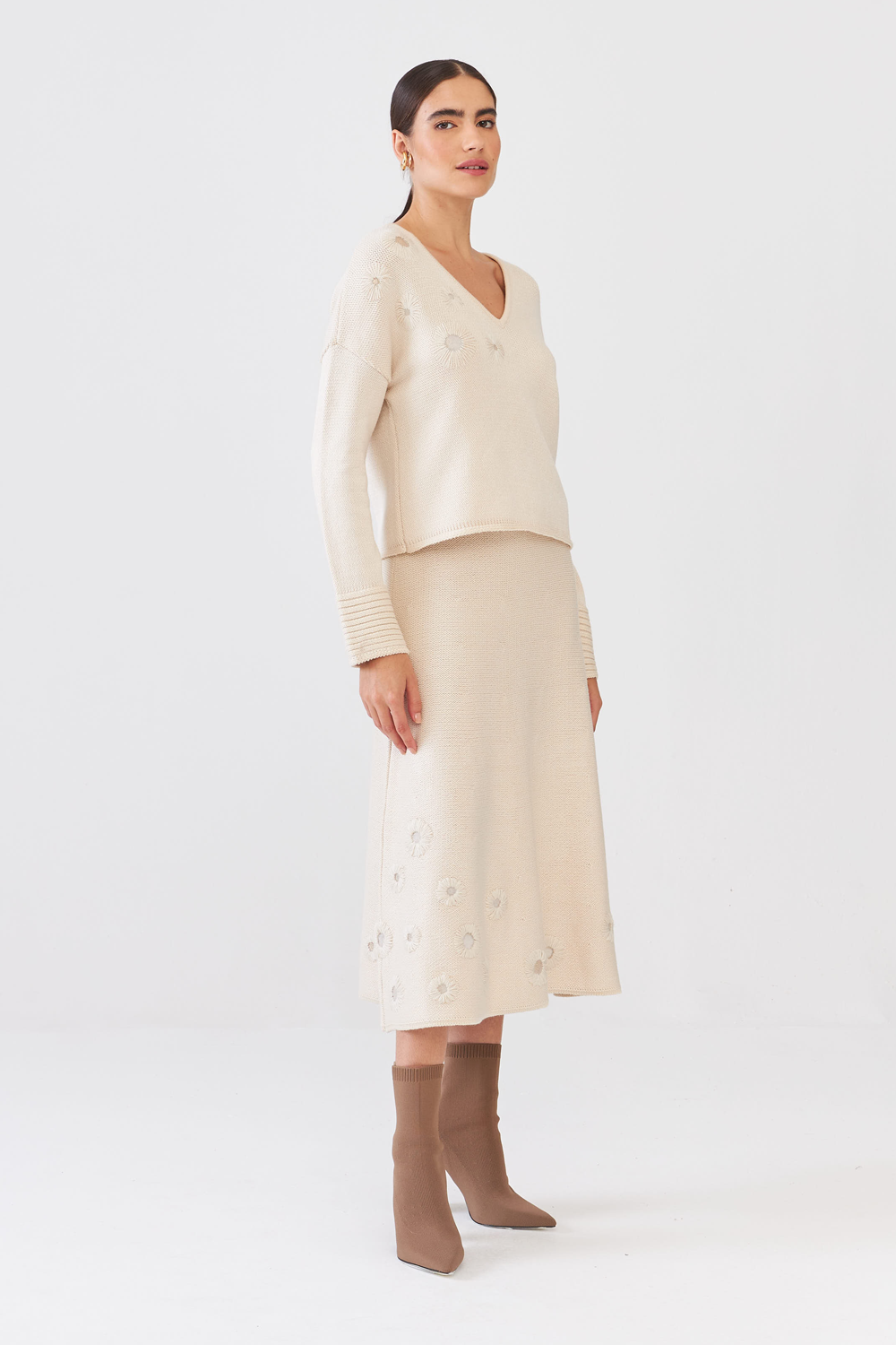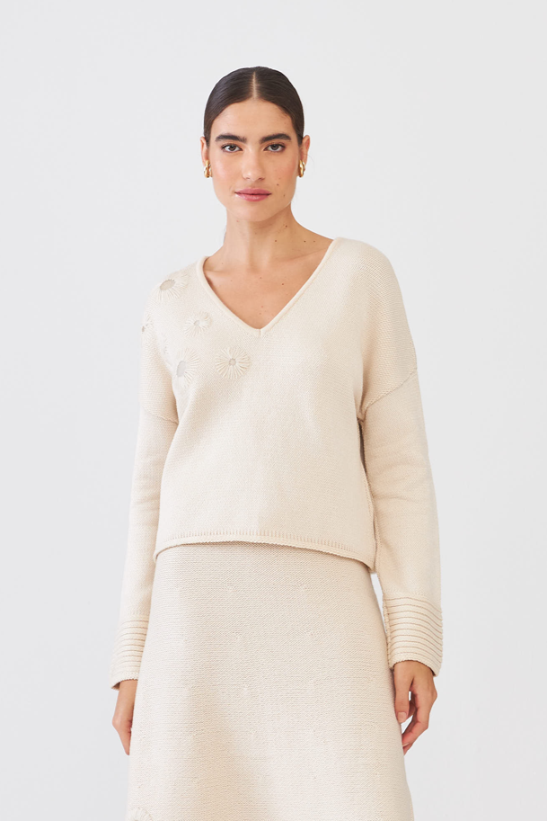 Esta blusa de tricot Ninive possui um bordado refinado, conferindo elegância e estilo à peça. Seu design em formato box garante conforto e liberdade de movimento. Perfeita para compor looks sofisticados e modernos.