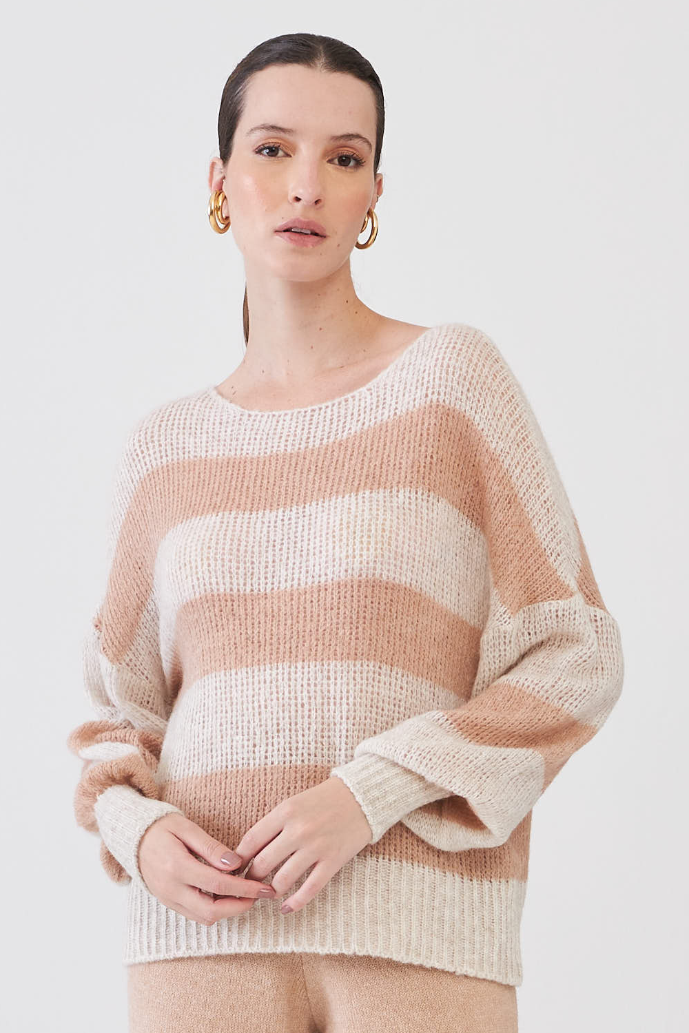 bicolor nas cores da nova coleção. A peça é tramada em ponto desagulhado que confere leveza e um toque cool ao modelo clássico. Destaque para as mangas longas levemente bufantes.