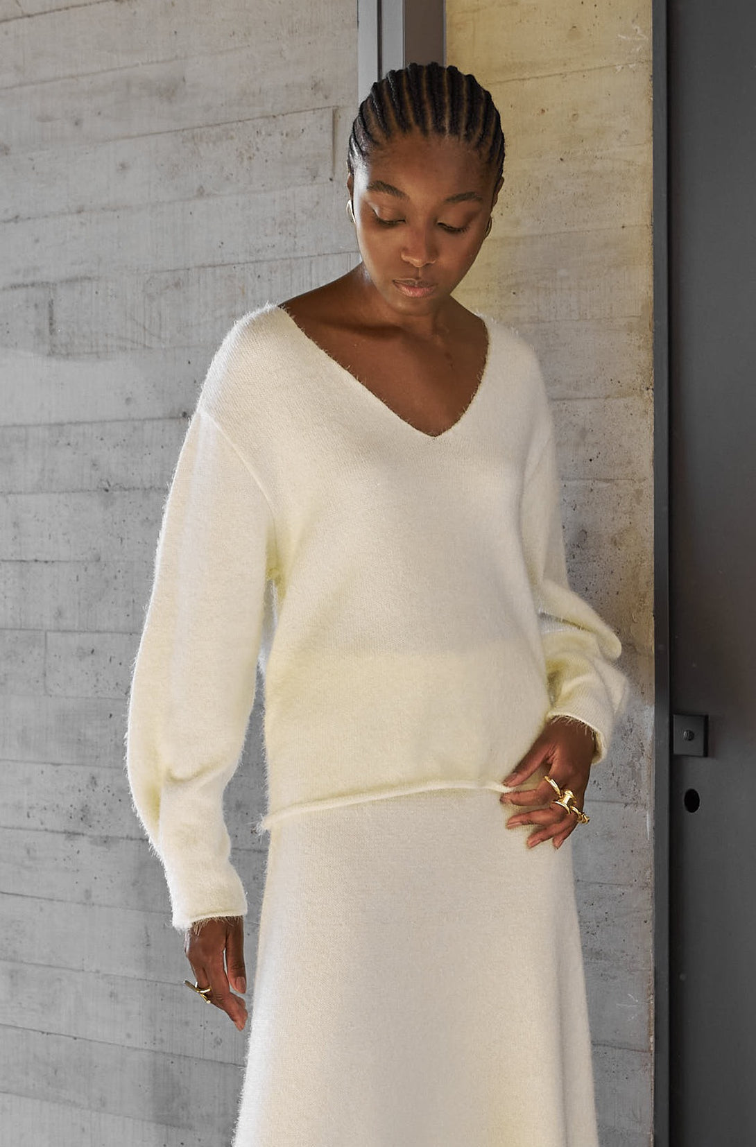 Esta blusa de tricot possui mangas com pregas dando um shape levemente bufante e decote V, criando um visual elegante e confortável. Feita em tricot peluche, é perfeita para os dias mais frios. Aposte nos tricots quentinhos para um visual de Inverno à prova de erros!