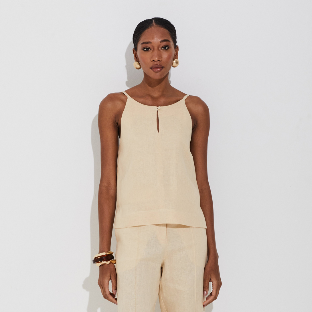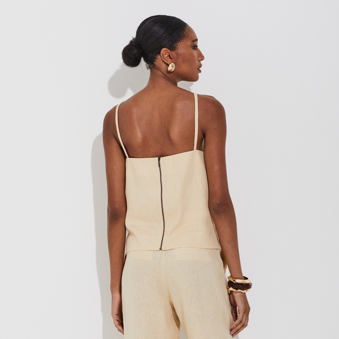 Blusa em linho 100% com corte reto e alças finas, ideal para os dias quentes com leveza. O recorte frontal com botão forrado e o decote nas costas valorizam o visual com sofisticação. Possui zíper metálico nas costas e forro em algodão, garantindo conforto ao vestir. As aberturas na barra complementam o caimento fluido e moderno.