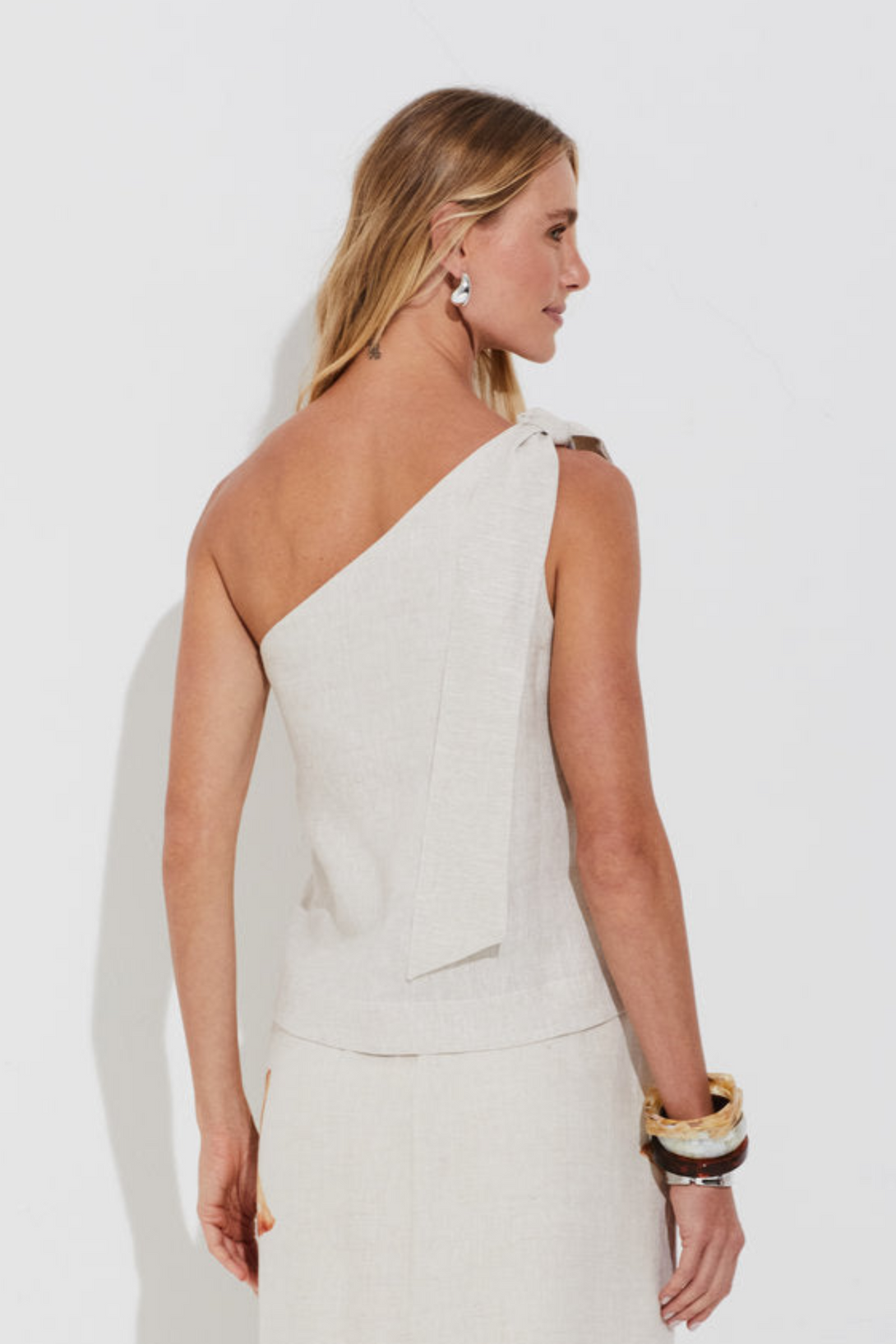 Blusa 100% linho de um ombro só, com modelagem confortável e barra levemente arredondada. O busto tem forro no mesmo tecido e zíper invisível na lateral, que facilita o vestir sem interferir no visual. Acompanha faixa solta que pode ser usada amarrada na alça ou na cintura, oferecendo diferentes formas de uso.