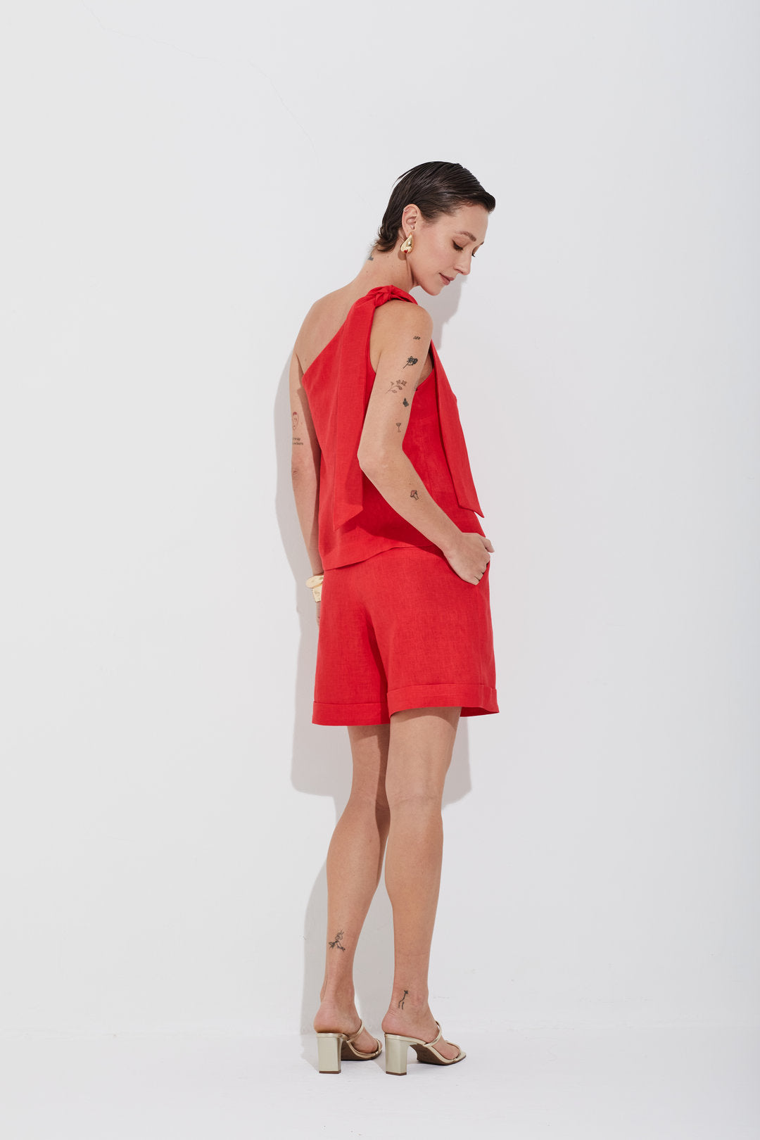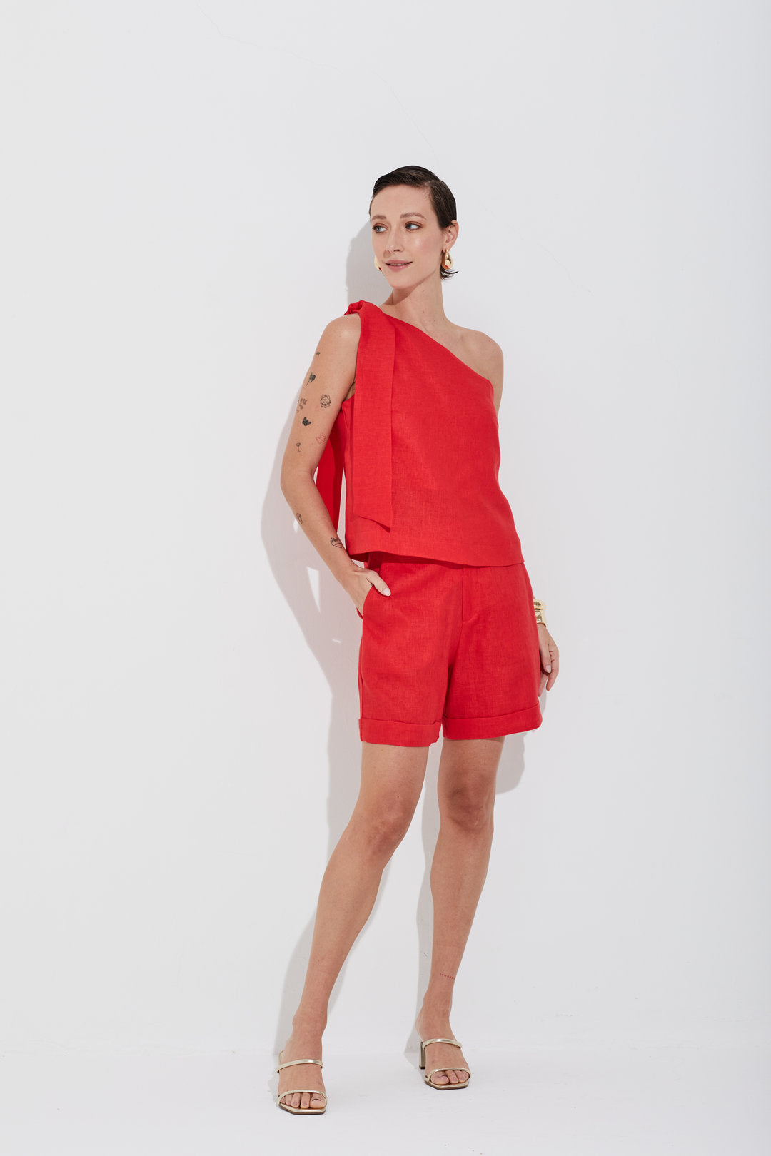 Blusa Em Linho 100% De Um Ombro Só Com Faixa Tomate