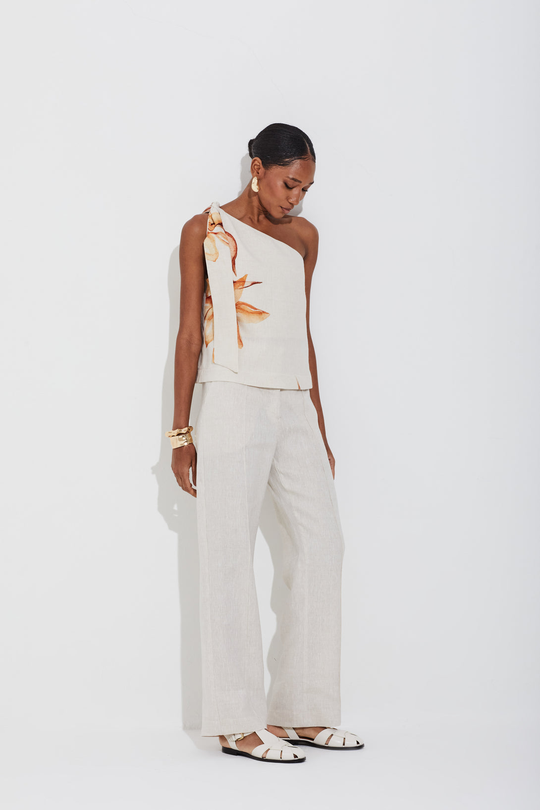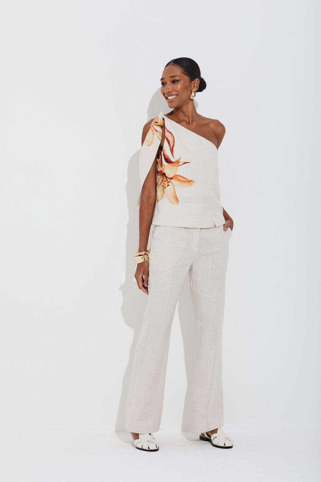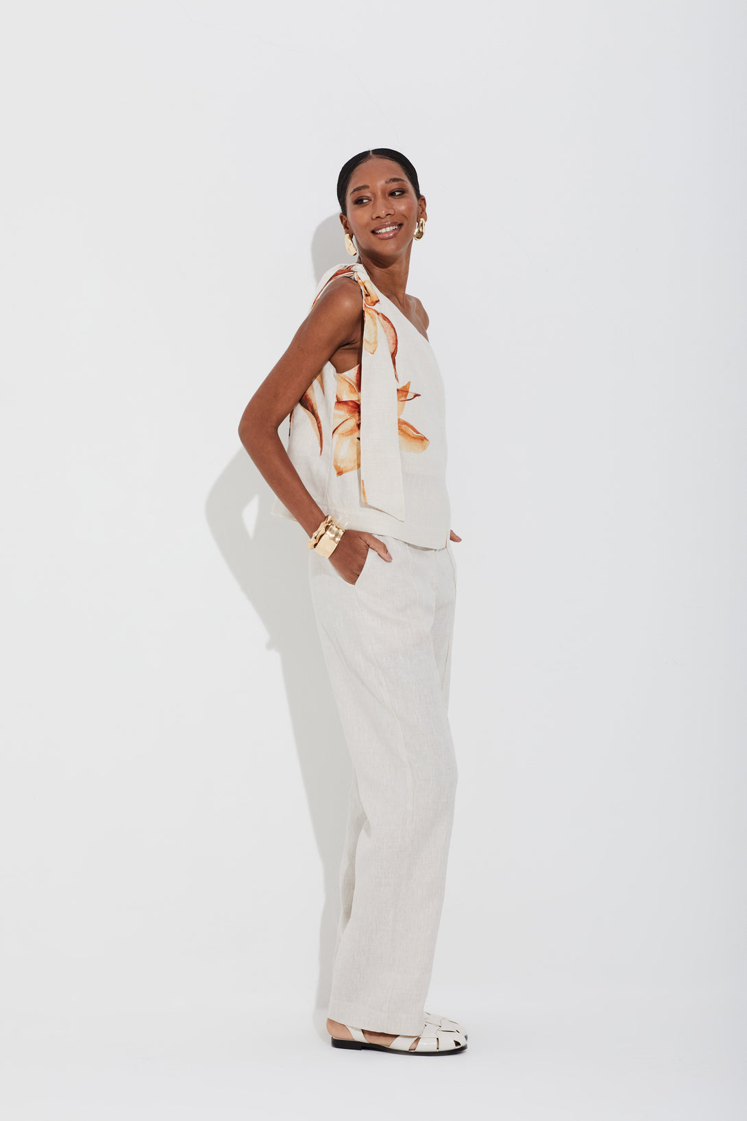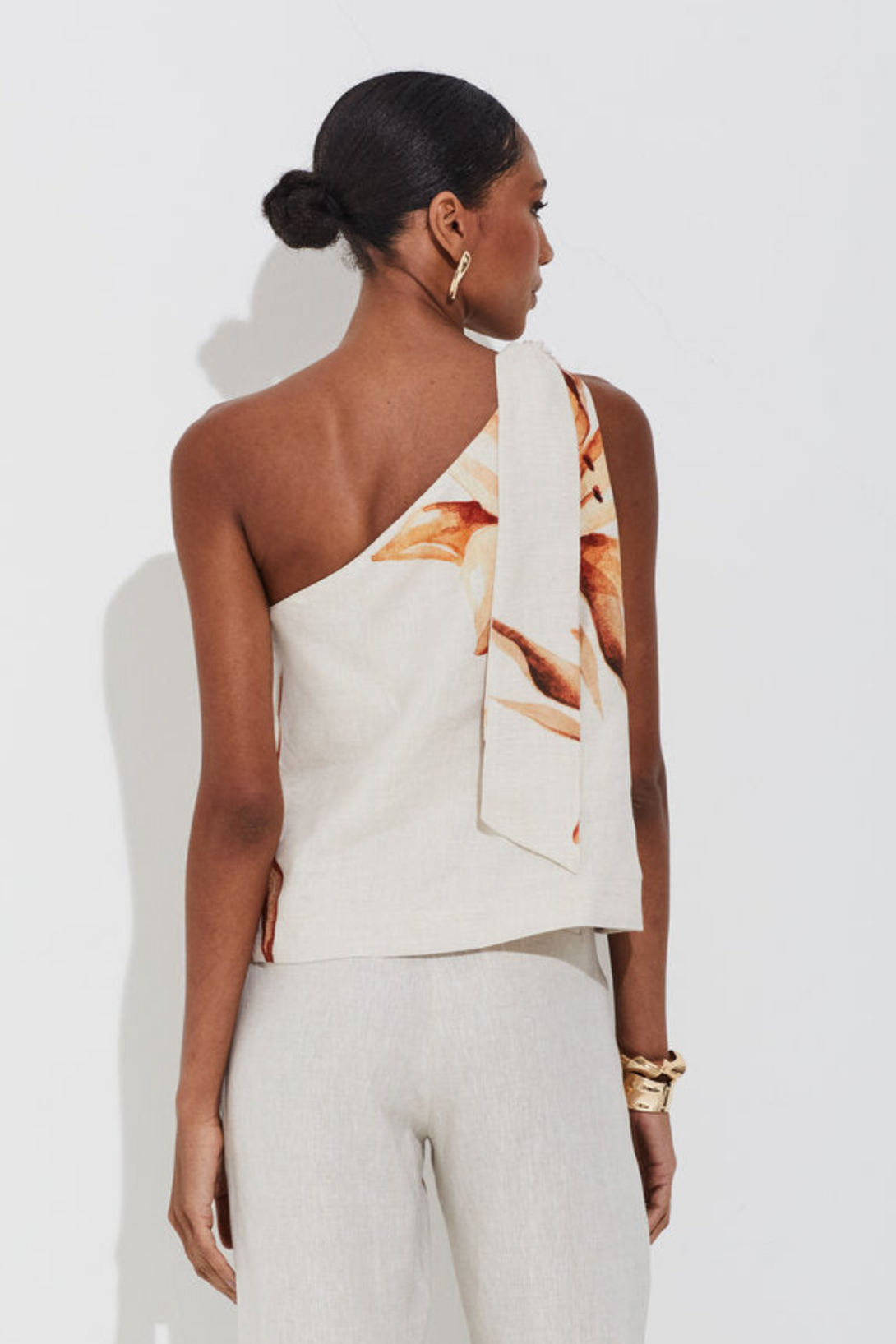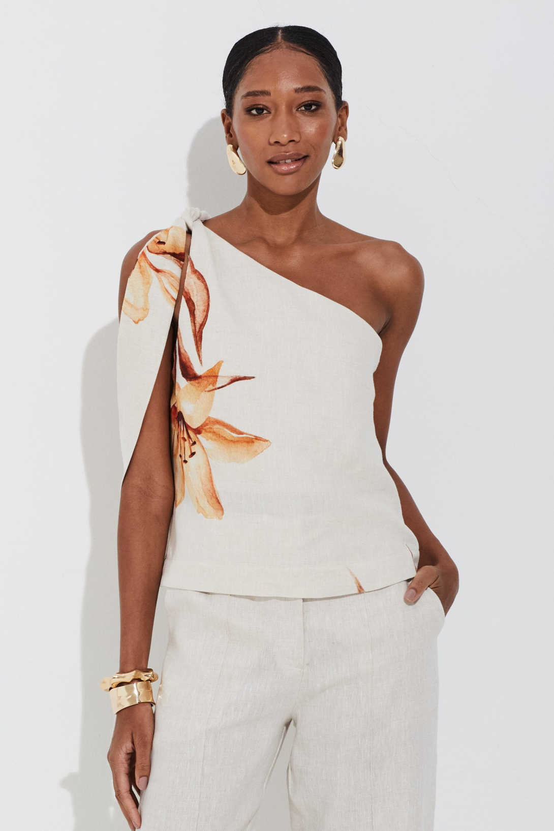 Blusa Em Linho 100% Estampa Florescer Um Ombro Só Com Faixa Estampado Linho Natural