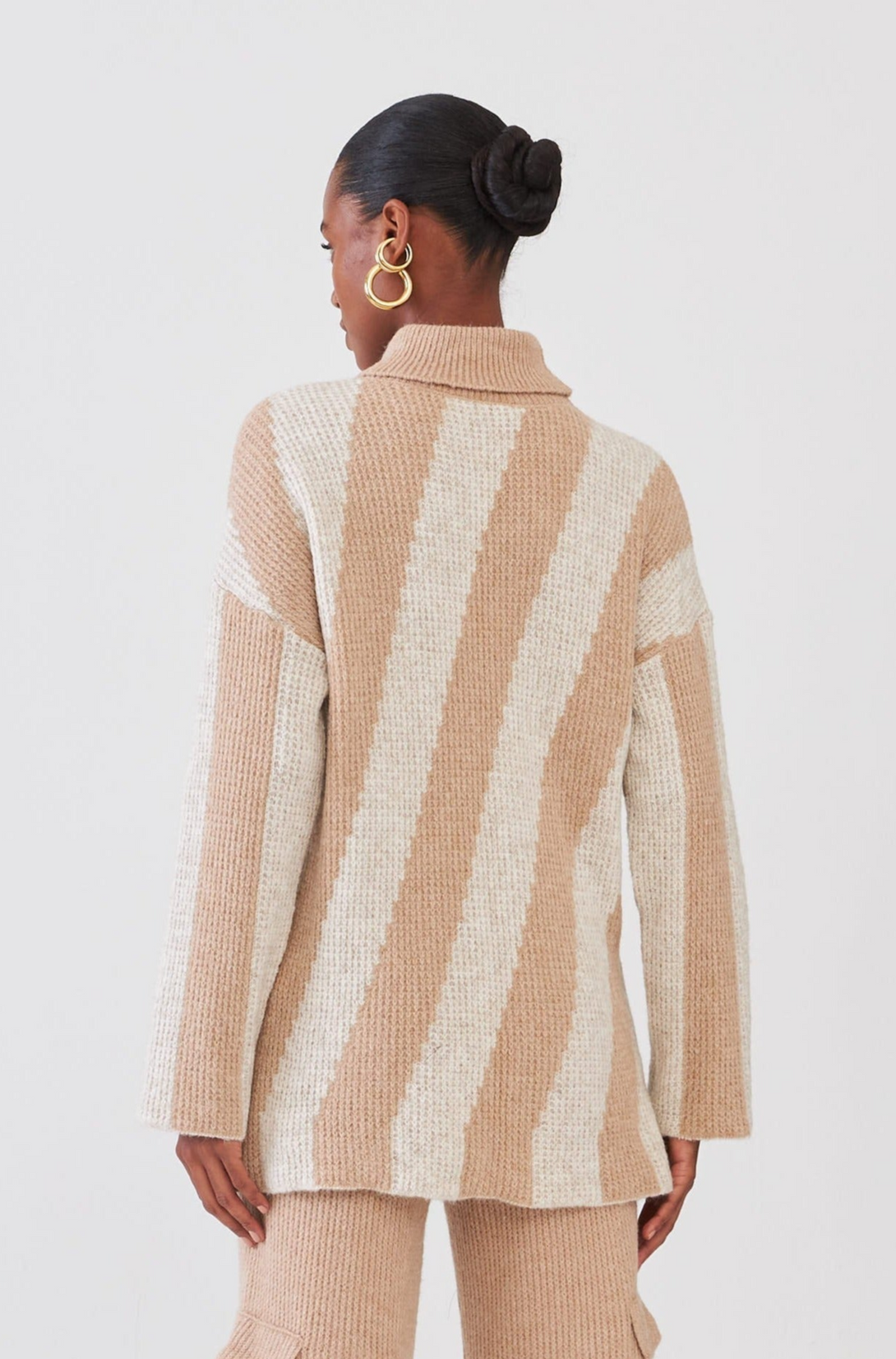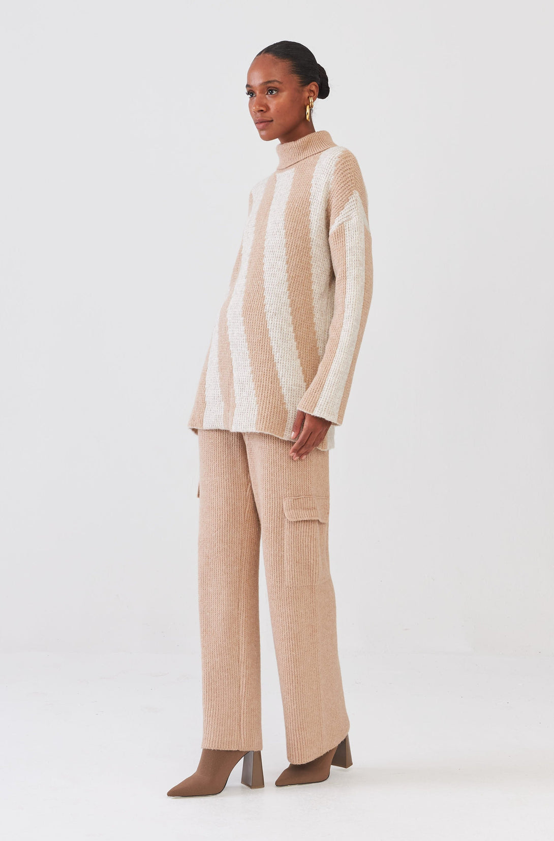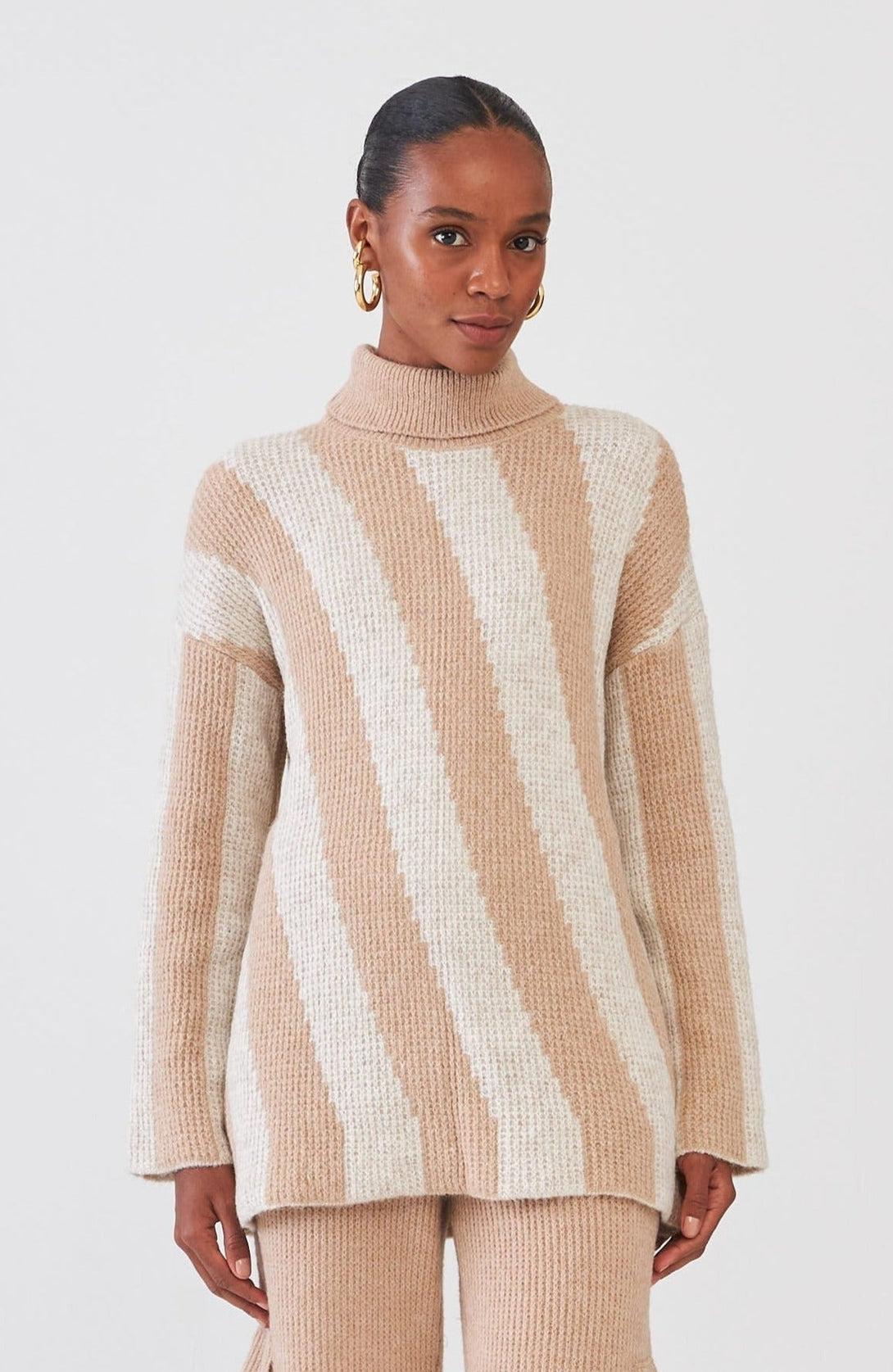 Blusa Em Tricot Listras Diagonais Bege Champagne