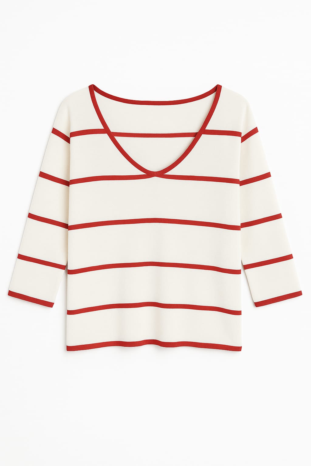 Blusa em tricot leve com manga 7/8 e decote em V, com modelagem confortável e levemente alongada. As listras harmonizam com os acabamentos na mesma cor, trazendo um toque de sofisticado. Uma peça versátil, ideal para quem busca conforto e um visual atemporal.