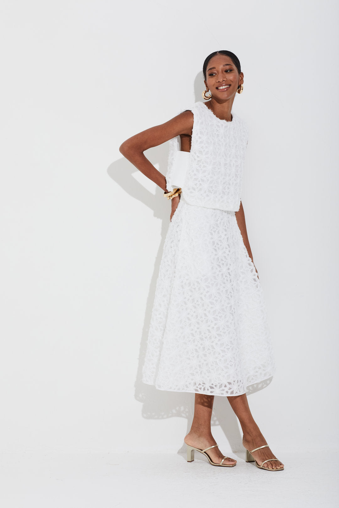 Blusa sem manga em tule bordado 3D, com flores em relevo que trazem textura e sofisticação ao visual. O detalhe lateral em tricot adiciona um toque moderno e diferenciado, tornando a peça versátil. Leve e delicada, é perfeita para quem busca estilo e conforto.