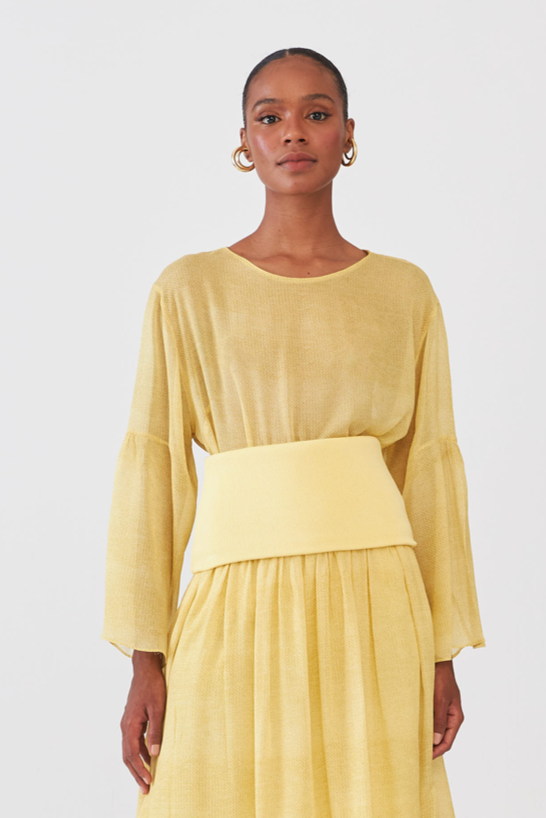 Blusa Estampada Manga Com Babado Transparência Knit Amarelo