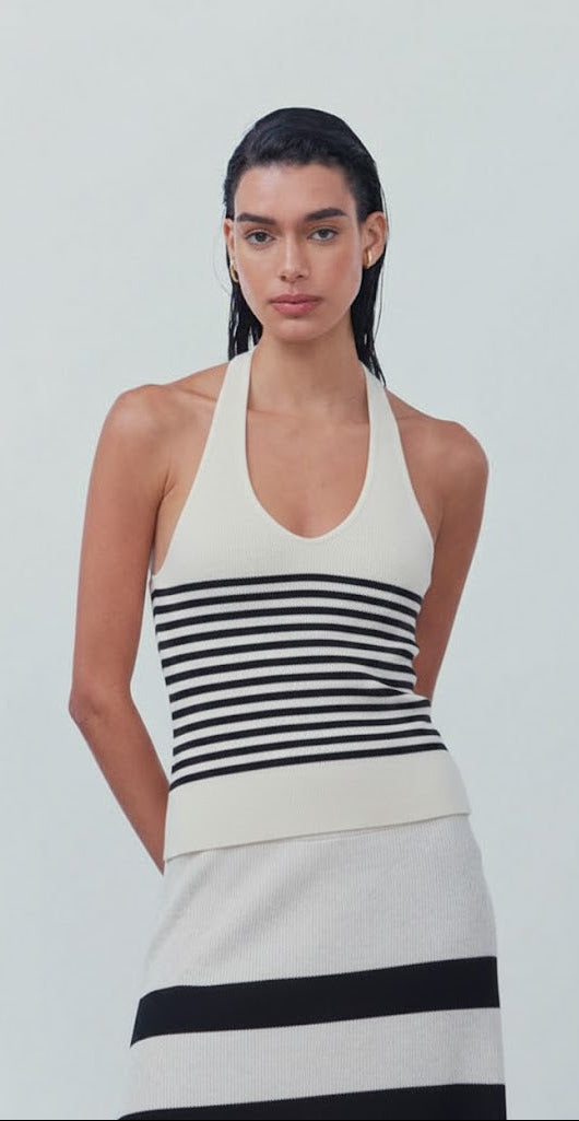A Blusa Frente Única Listrada em Tricot é confeccionada com fio vórtex, destacando-se pelo caimento justo ao corpo e alças finas. É uma peça versátil e atemporal.