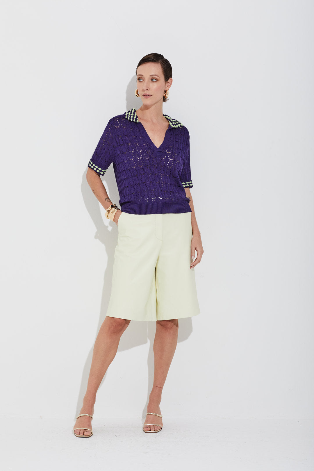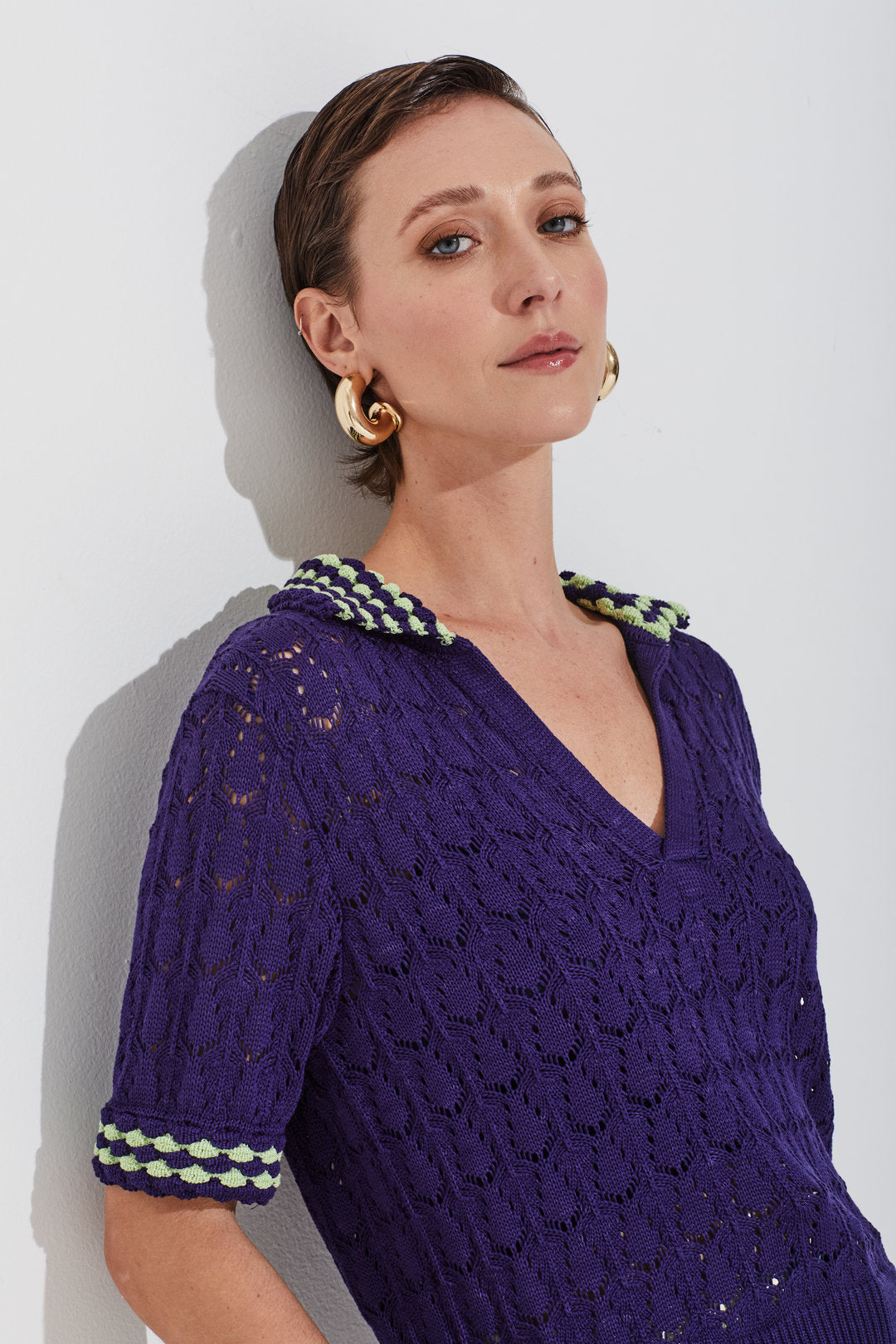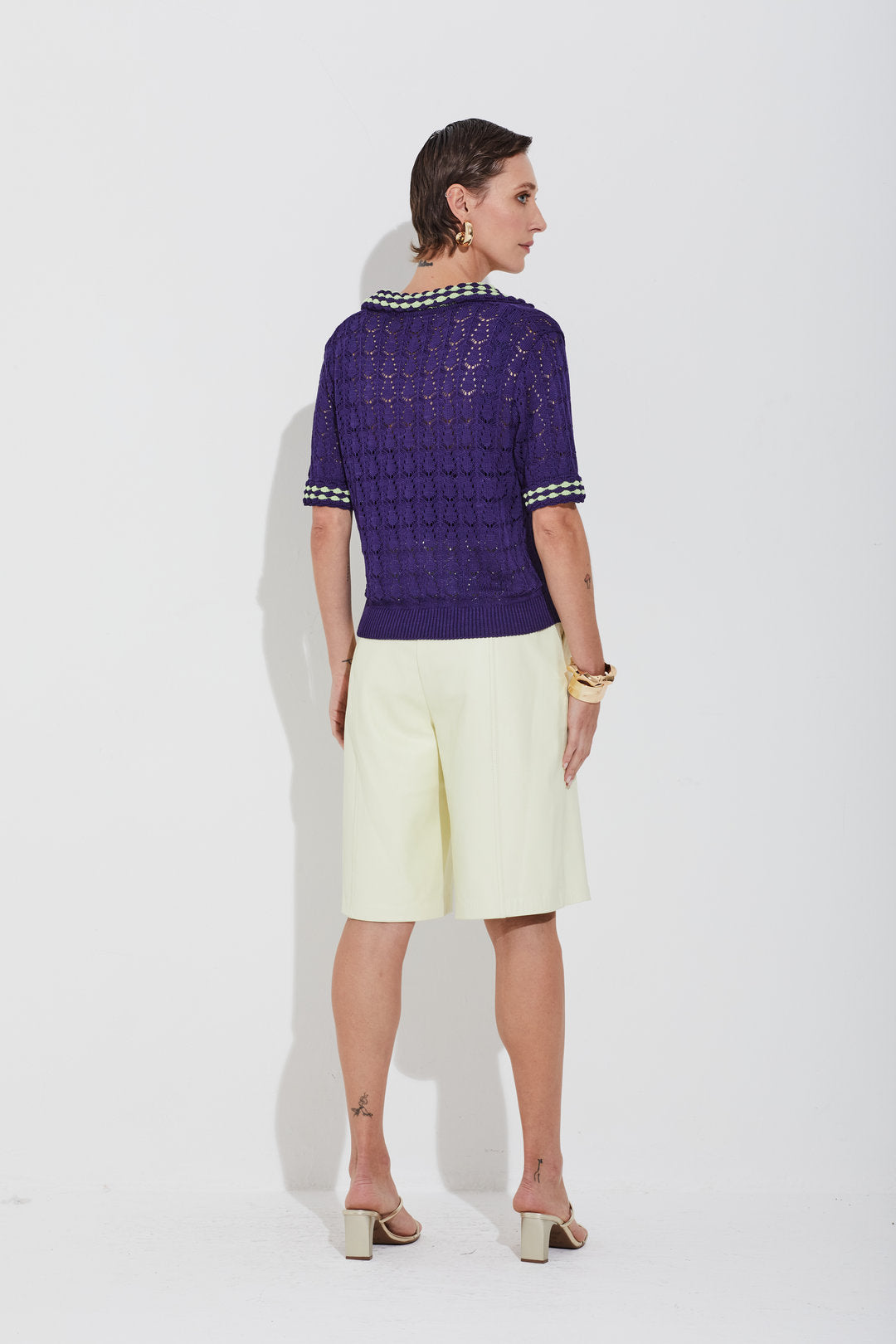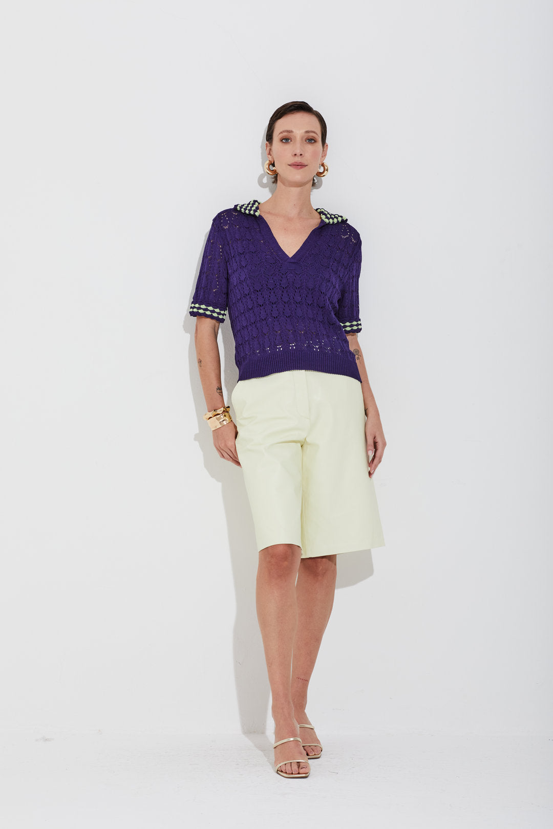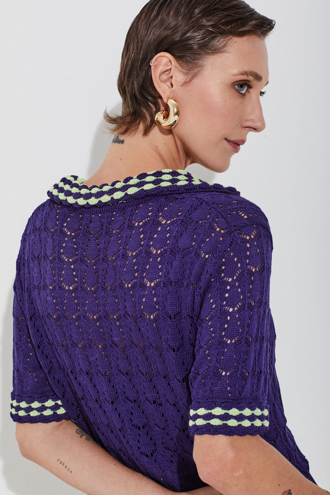 Blusa em tricot com gola polo e ponto que remete ao crochê. Detalhes coloridos na gola e nos punhos das mangas curtas trazem referência ao trabalho manual, dando um charme especial à peça. Possui mangas curtas, modelagem e comprimento regulares. Ideal para looks casuais com um toque handmaid e atual.