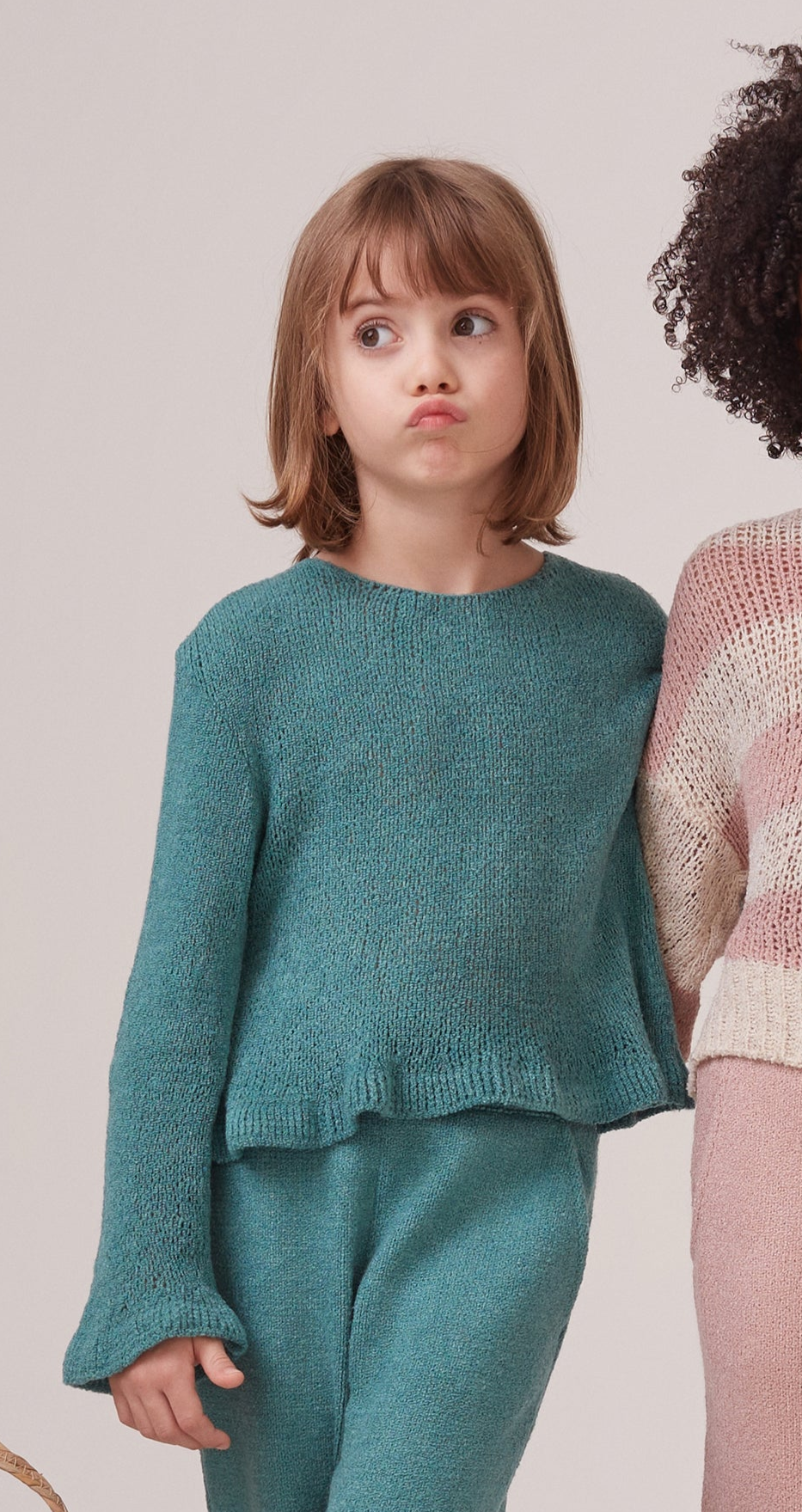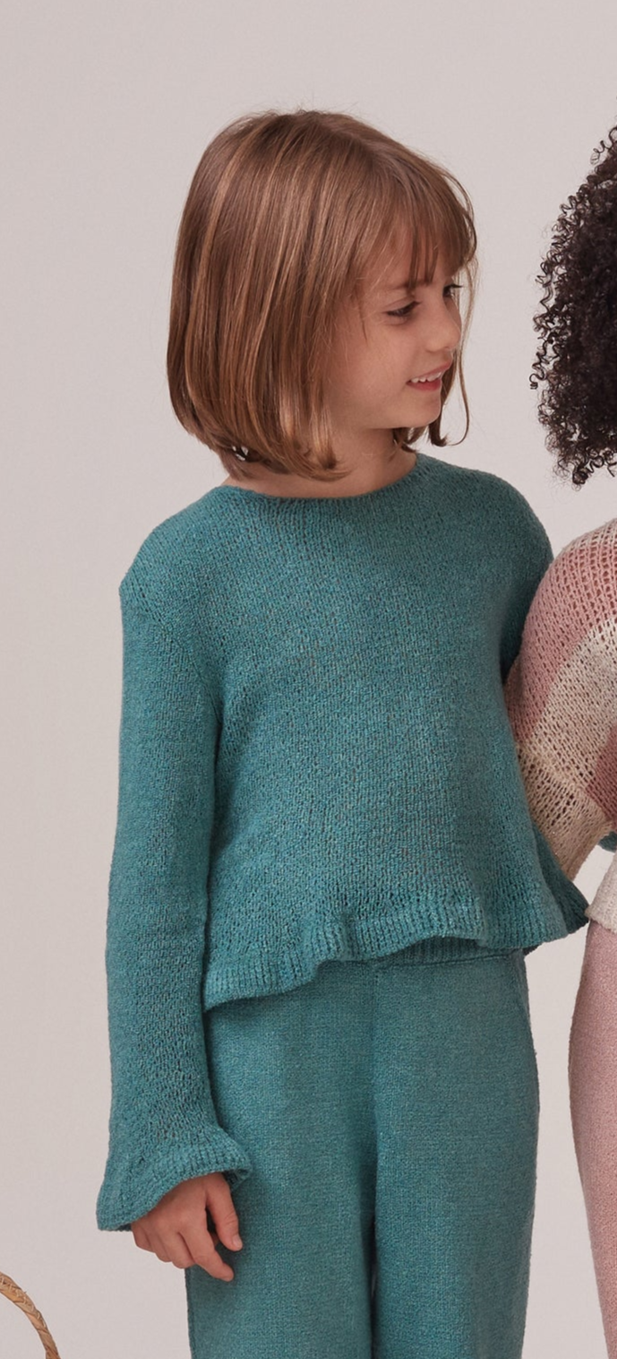 Blusa Infantil Manga Longa Detalhe No Punho Em Tricot Coral Azul