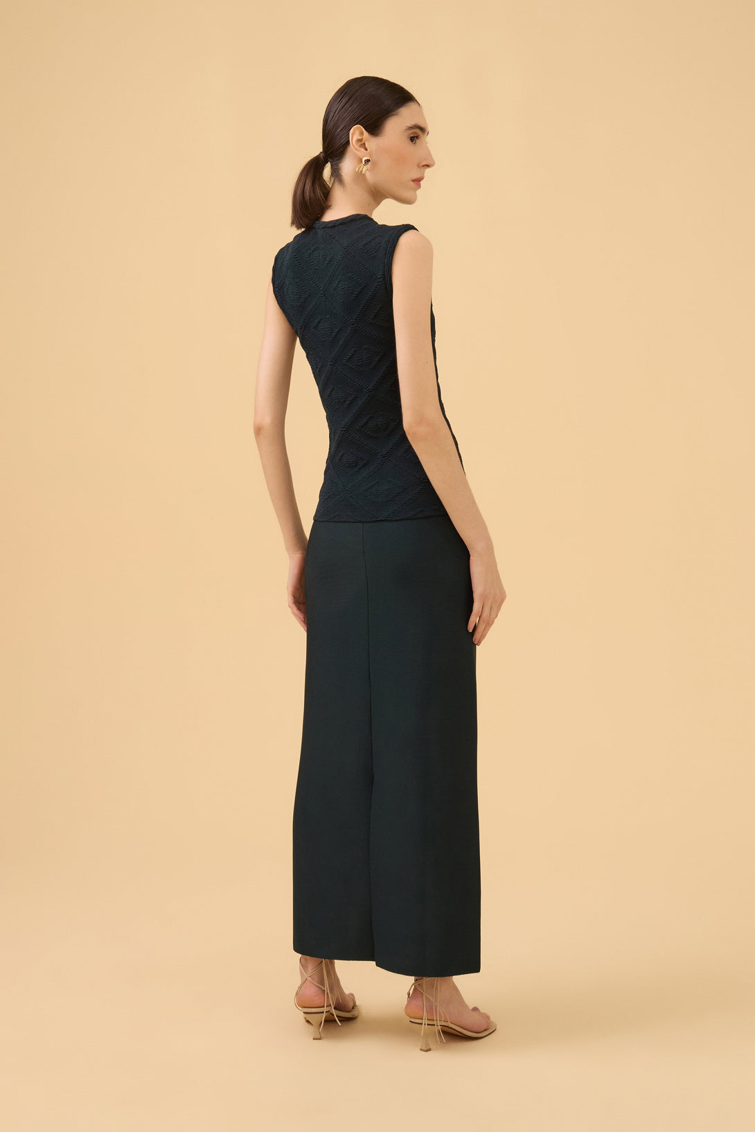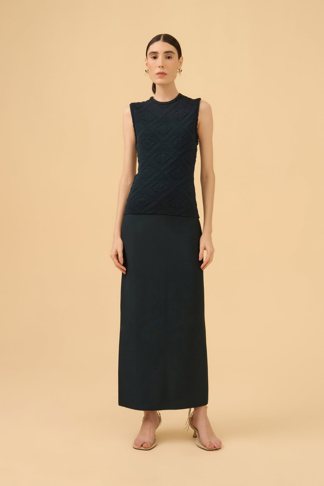 Blusa Sem Mangas Jacquard Textura Em Tricot Tecido em tricot estruturado com fios de viscose com poliamida com detalhes em jacquard com relevo e padrão geométrico, gola redonda, sem mangas e modelagem justa ao corpo.