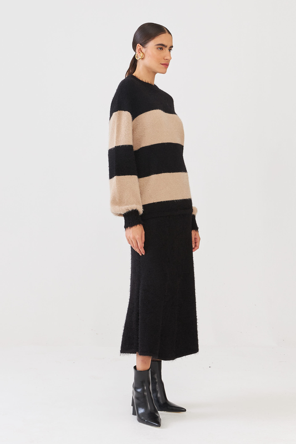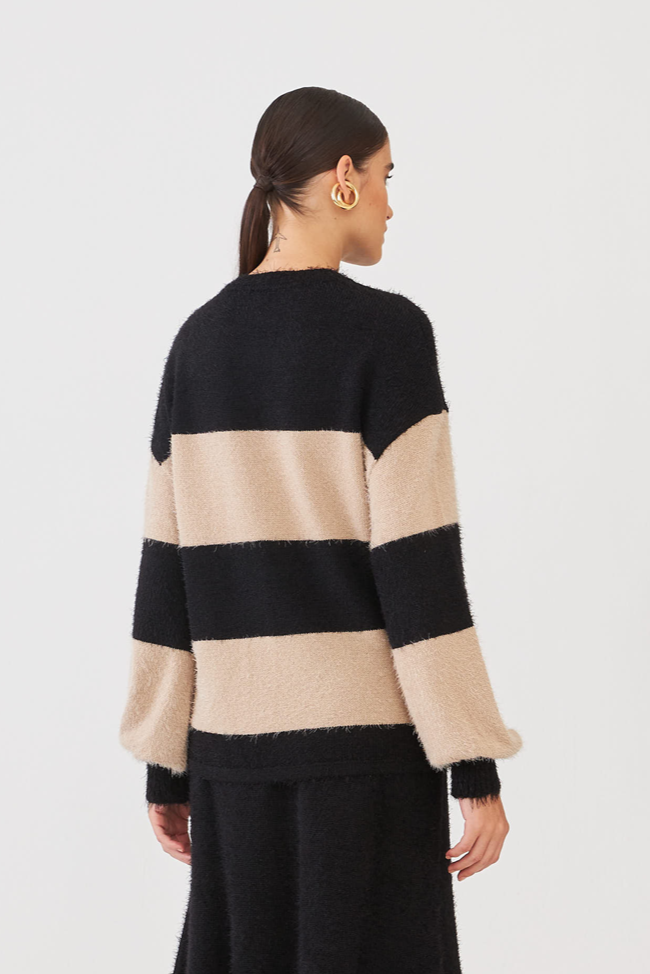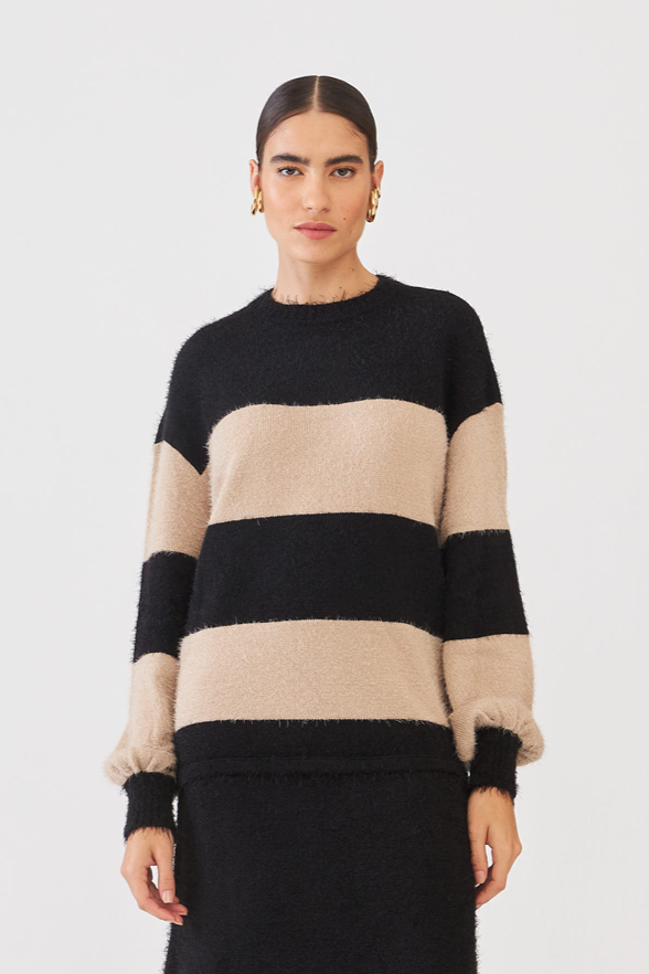 Esta blusa de tricô peluche apresenta um design com listras bicolor, oferecendo um toque moderno e elegante ao seu look. Feita em tricot macio e confortável, é perfeita para dias mais frios e pode ser facilmente combinada com outras peças para criar diferentes estilos.