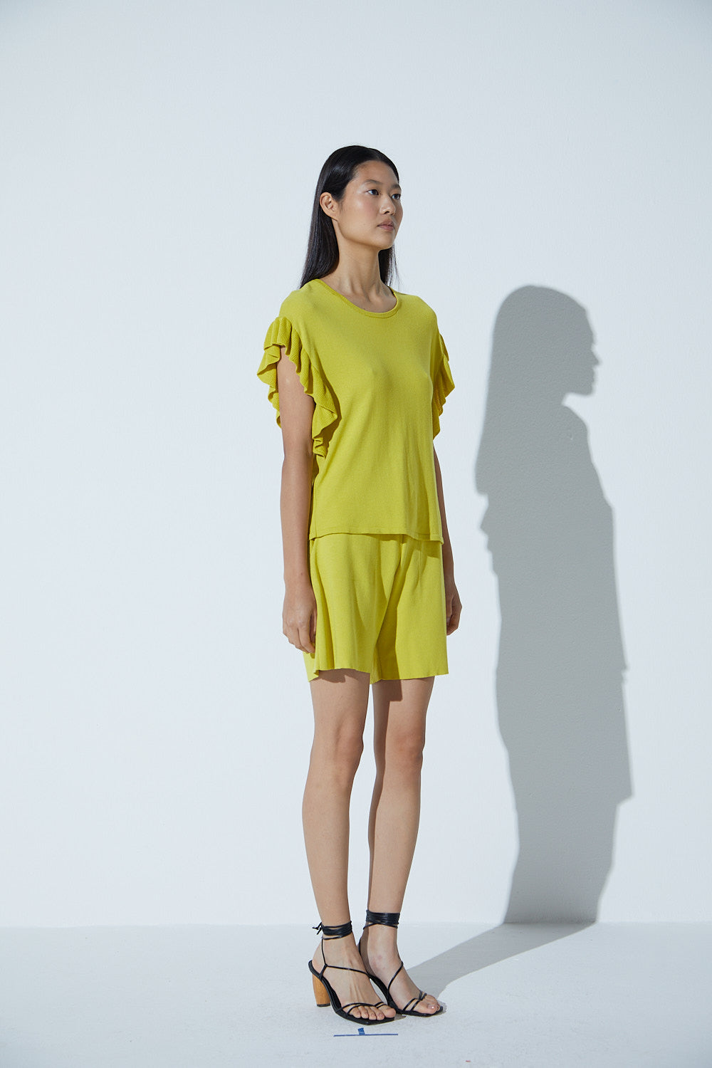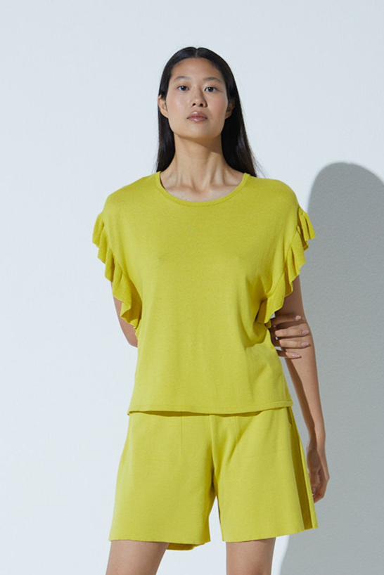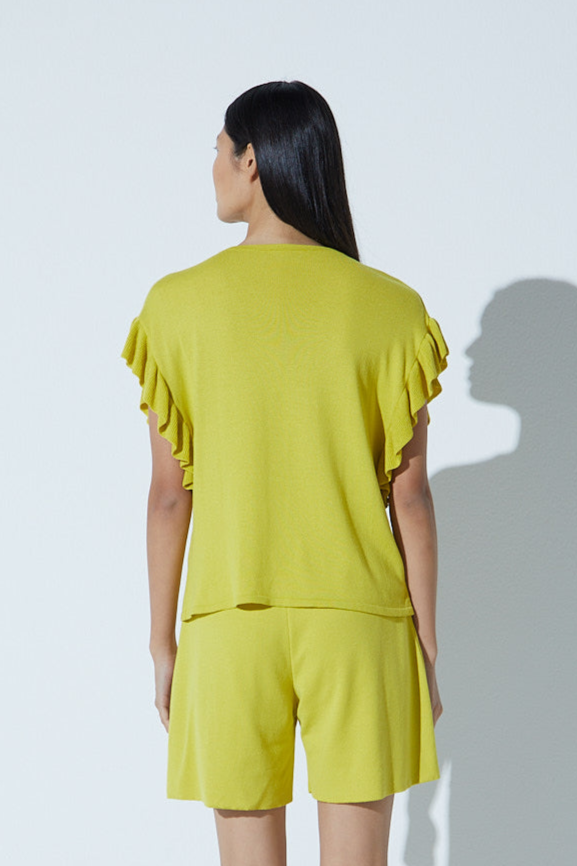 A Blusa Manga Curta Babado Em Tricot, desenvolvida em tricô, oferece conforto e feminilidade. Com mangas curtas, possui acabamento babado, destacando os detalhes. Com design moderno, o tecido leve é perfeito para qualquer estação.