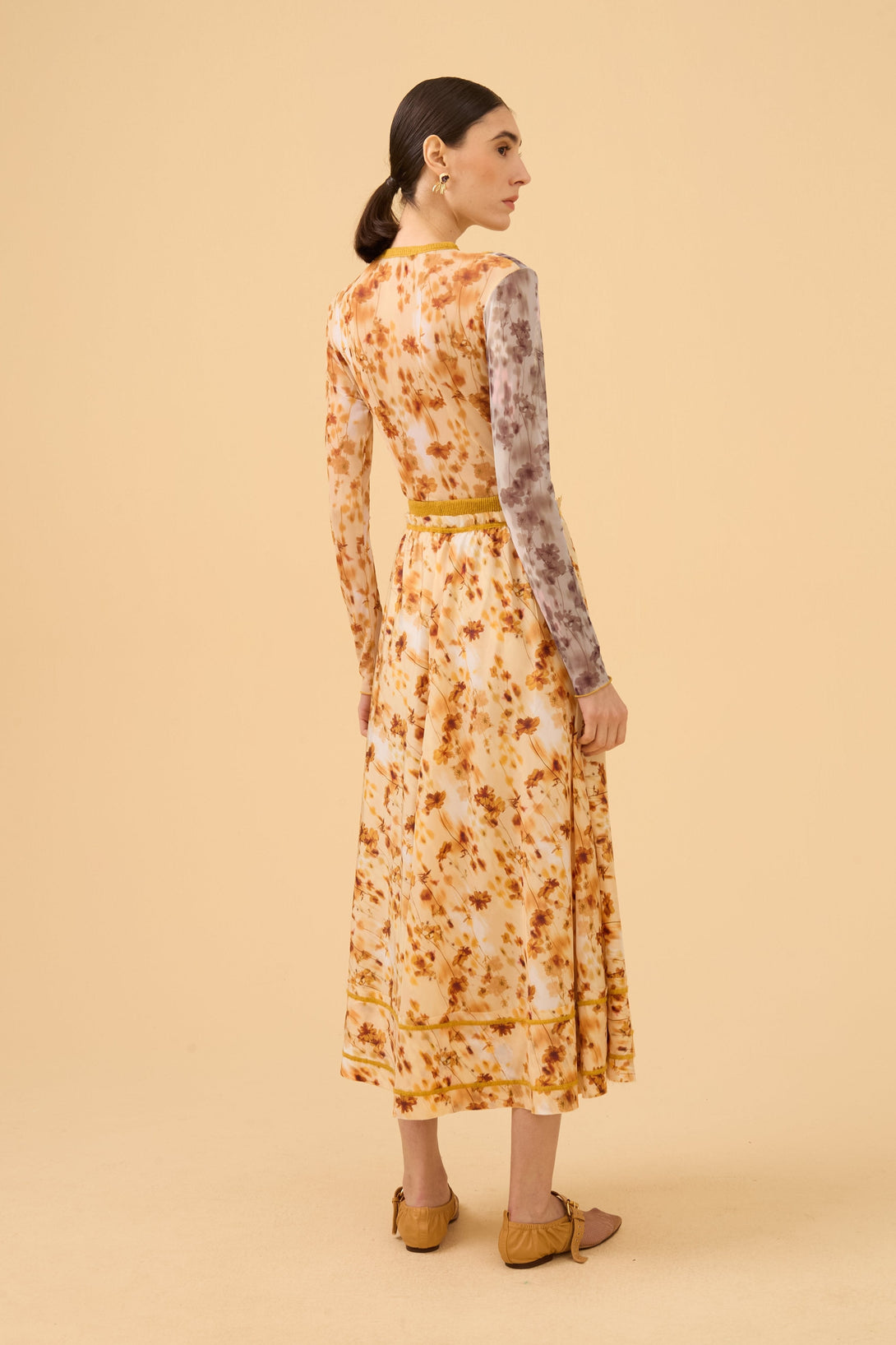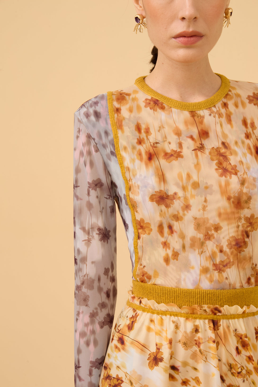 Blusa Manga Longa Em Tule Estampado Comb. Azeite
