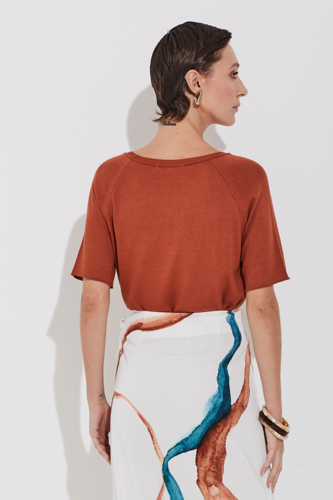 Com gola canoa, mangas curtas e modelagem raglan, esta peça da nossa Linha VF Essencial traz um visual leve e contemporâneo. A construção das mangas oferece conforto nos movimentos e um caimento natural nos ombros. Confeccionada em tricot de fio de viscose, tem toque macio, modelagem confortável e comprimento regular. Ideal para composições versáteis no dia a dia.