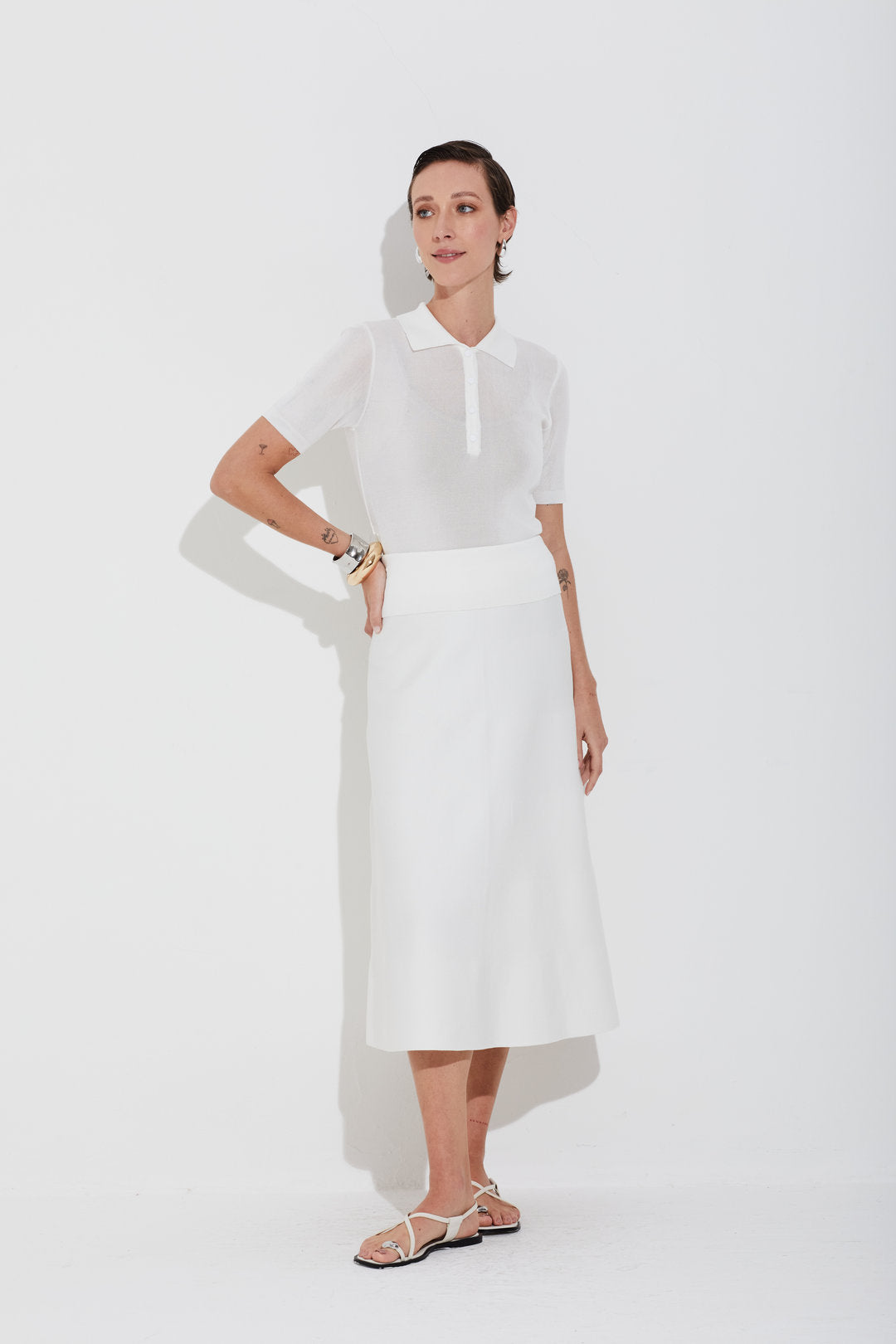 Blusa em tricot confeccionada em fio acetinado super fino e leve, com brilho discreto e toque macio. Com gola polo, botões forrados e mangas curtas, tem modelagem ajustada e comprimento regular, que valoriza a silhueta com elegância. Uma peça da nossa Linha Essencial — versátil, atemporal e ideal para diferentes ocasiões.