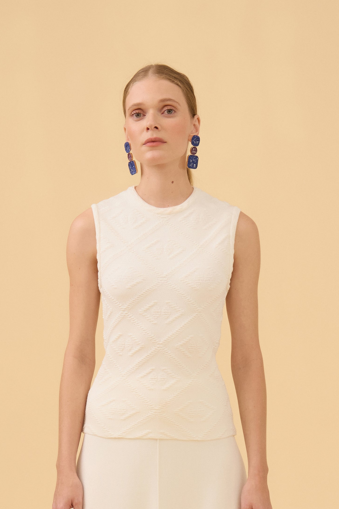 Blusa Sem Mangas Jacquard Textura Em Tricot Tecido em tricot estruturado com fios de viscose com poliamida com detalhes em jacquard com relevo e padrão geométrico, gola redonda, sem mangas e modelagem justa ao corpo.