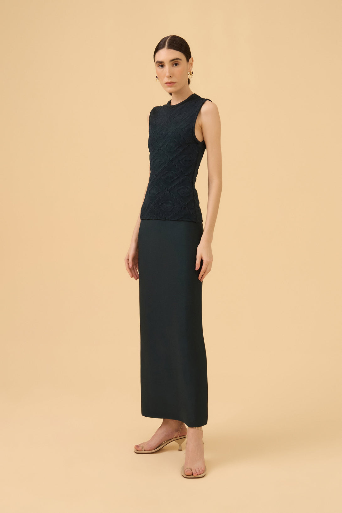 Blusa Sem Mangas Jacquard Textura Em Tricot Tecido em tricot estruturado com fios de viscose com poliamida com detalhes em jacquard com relevo e padrão geométrico, gola redonda, sem mangas e modelagem justa ao corpo.