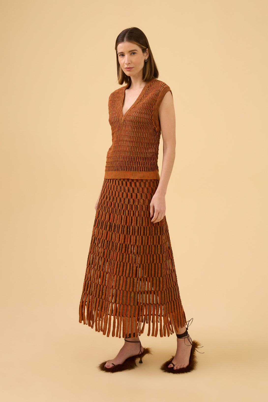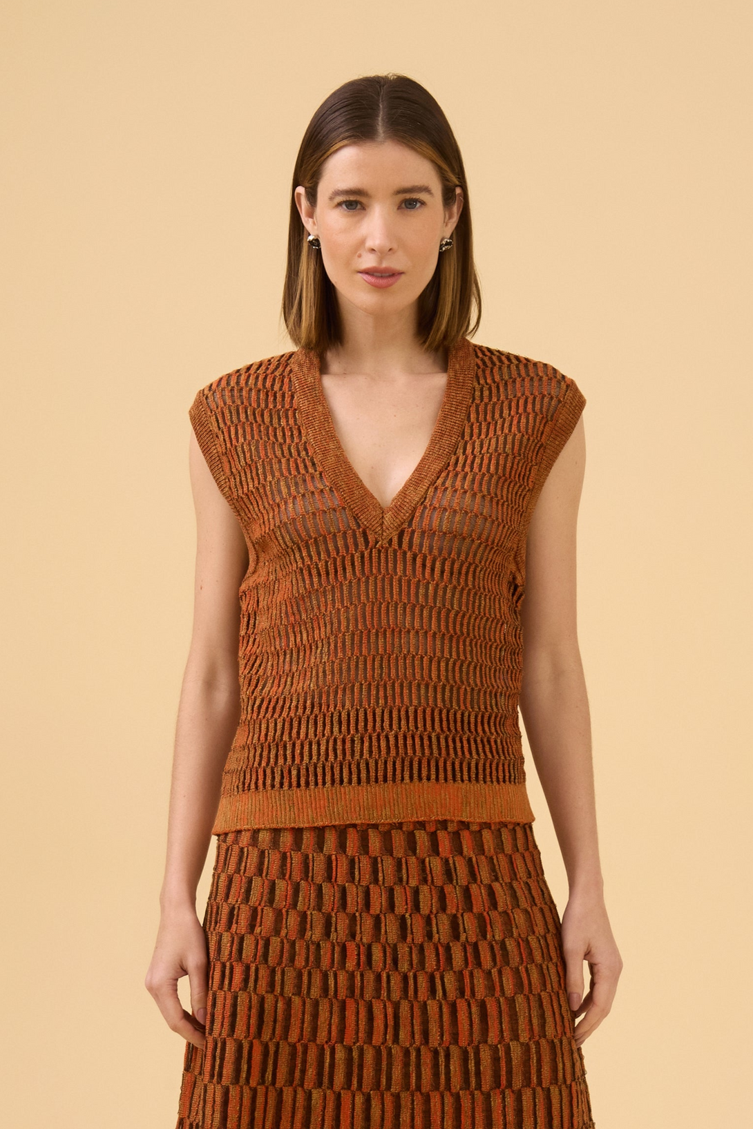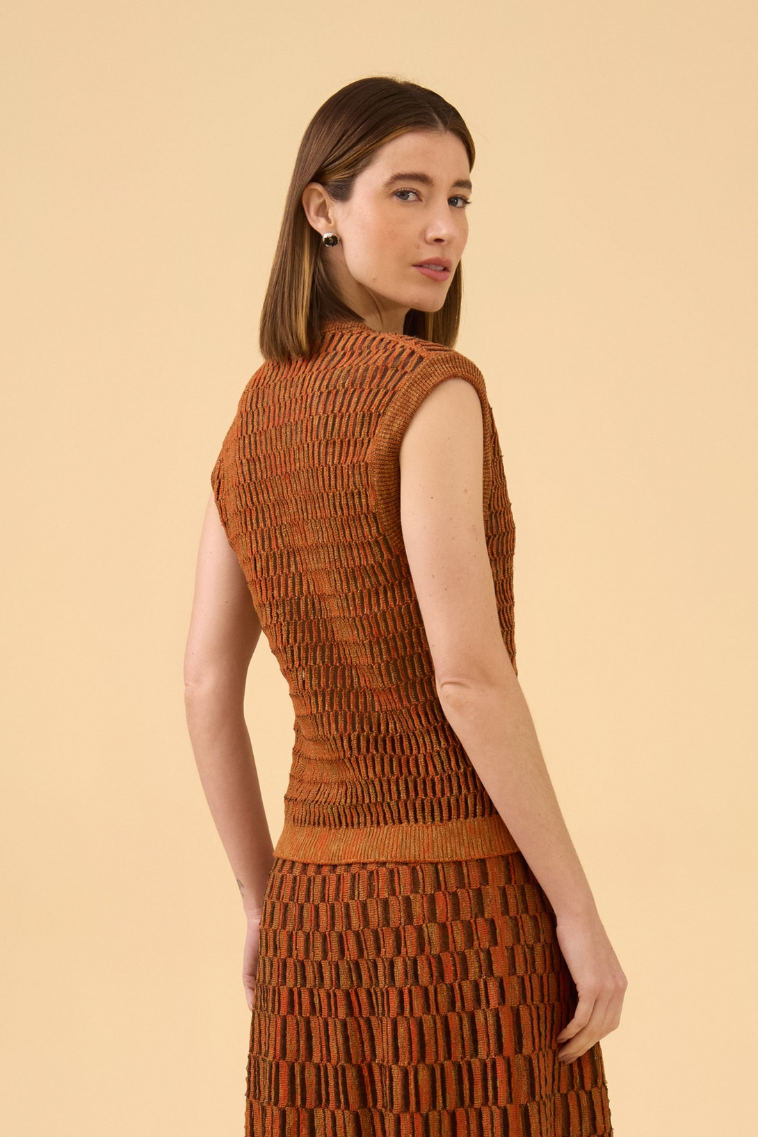 Blusa Sem Mangas Com Transparência Em Tricot Mescla Doce De Leite + Vermelho Scarlat