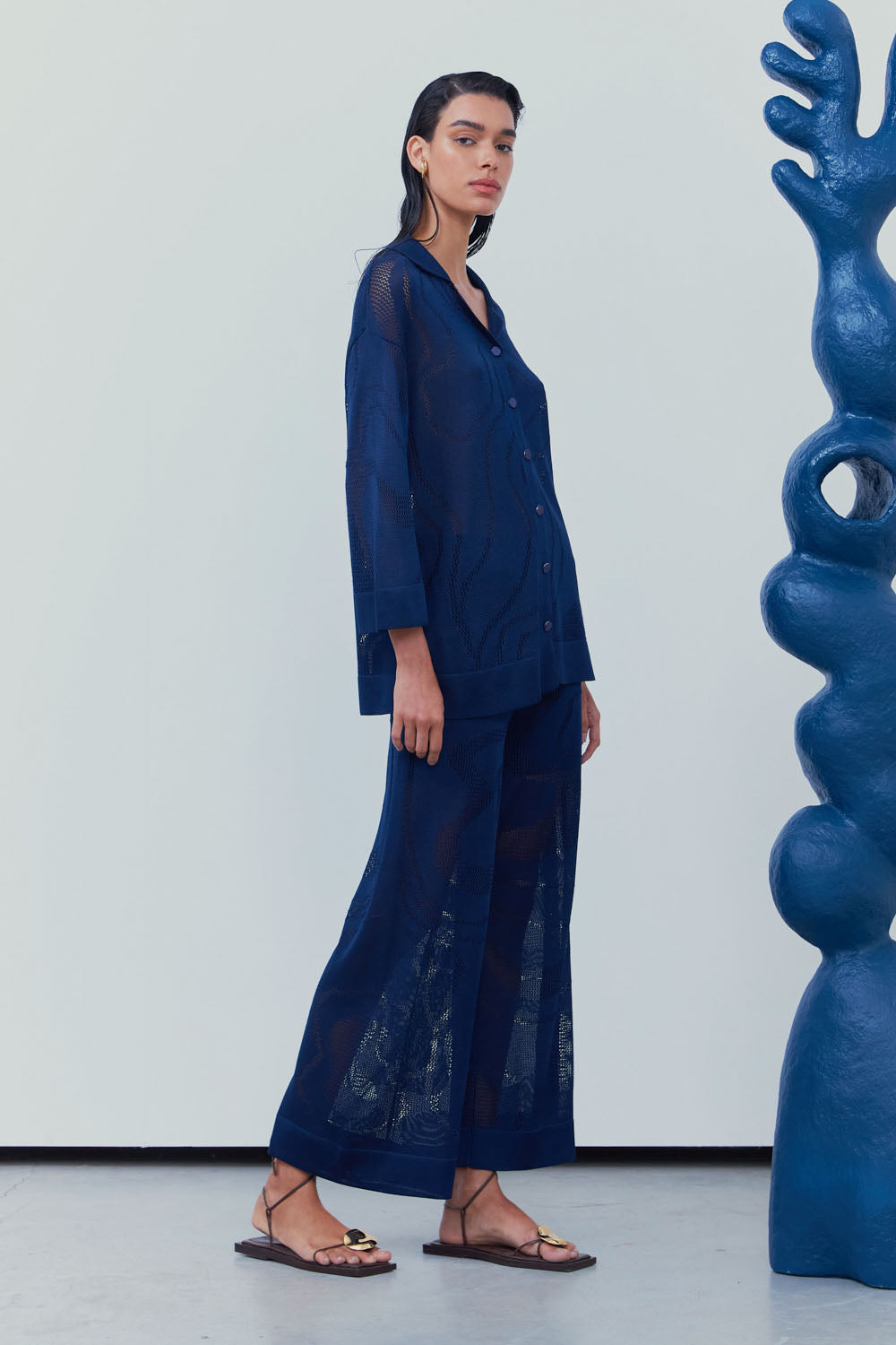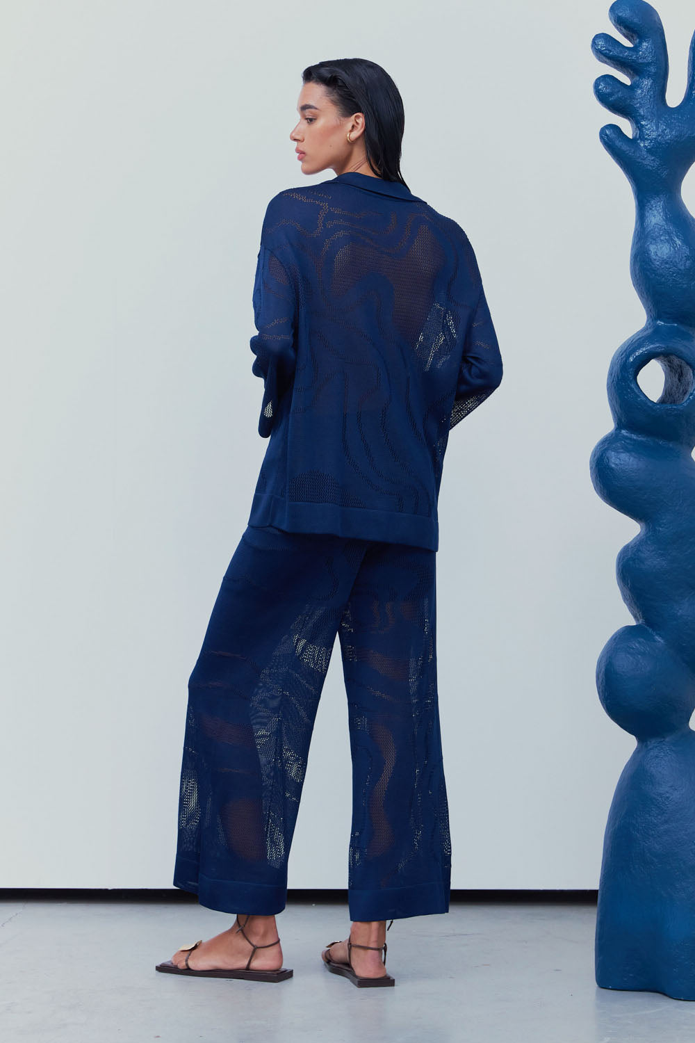 Tecida em fio Rayon, a calça com tela ondulada exibe uma técnica de furos com design orgânico, modelagem wide e um brilho sutil.