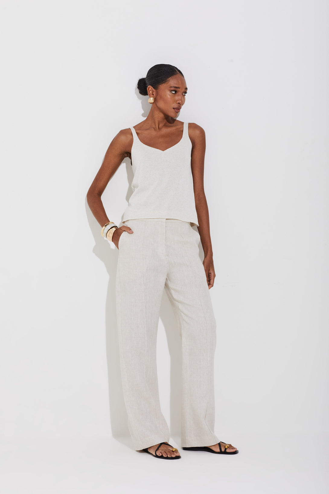 Calça de alfaiataria confeccionada em linho 100%, com cintura alta e pernas retas que valorizam a silhueta. A nervura frontal reforça o caimento elegante, enquanto os bolsos faca e o fechamento com zíper e cinco las douradas garantem funcionalidade e sofisticação. Uma peça atemporal, perfeita para composições que transitam entre o formal e o casual com estilo premium.