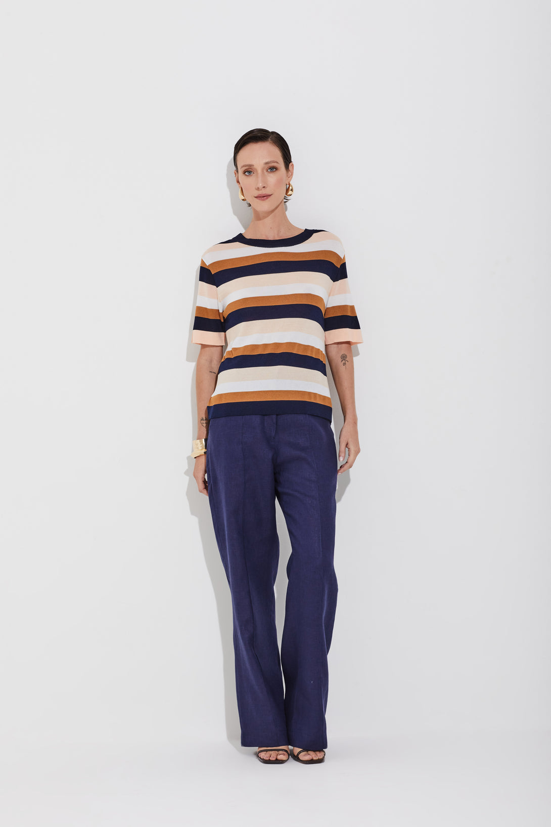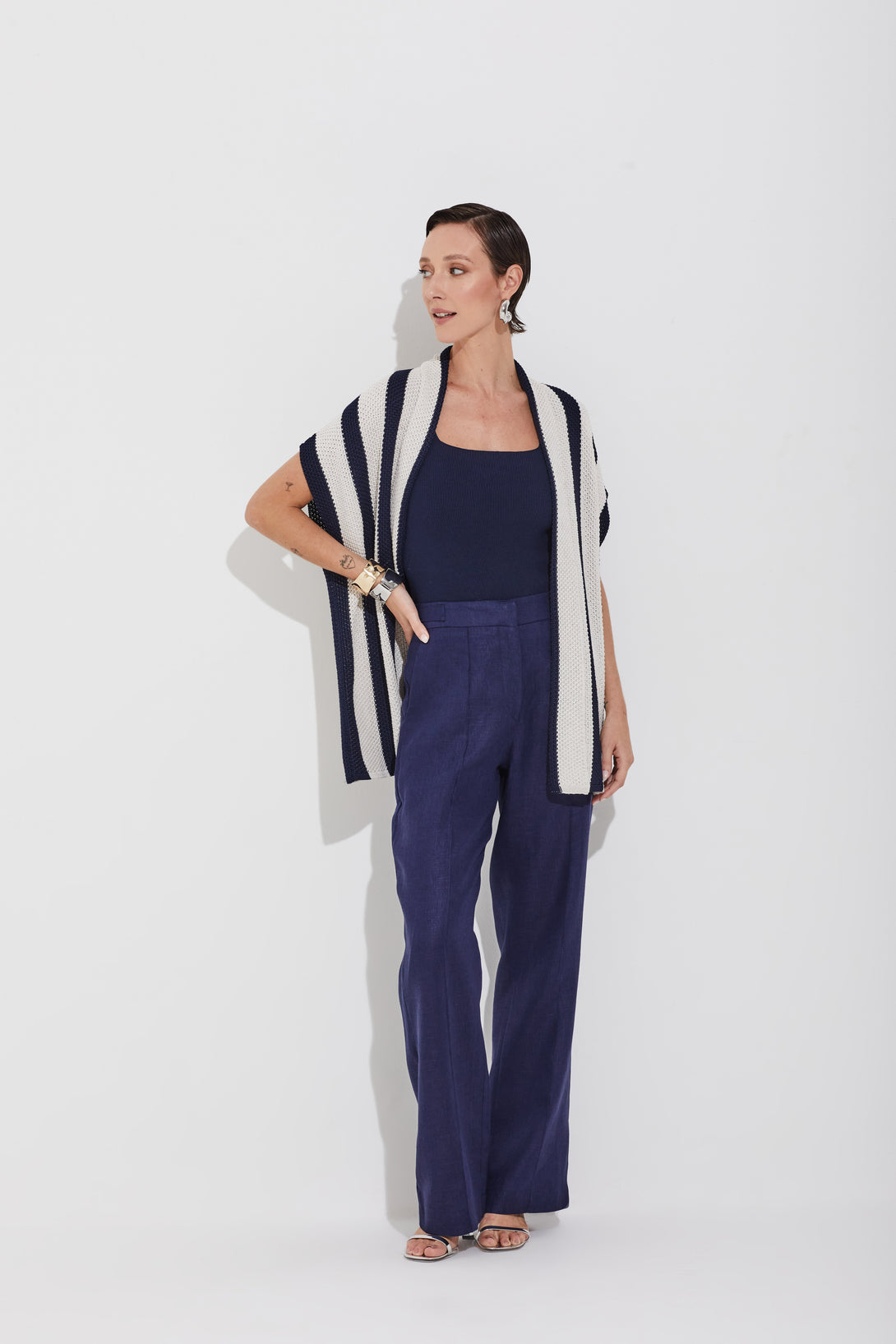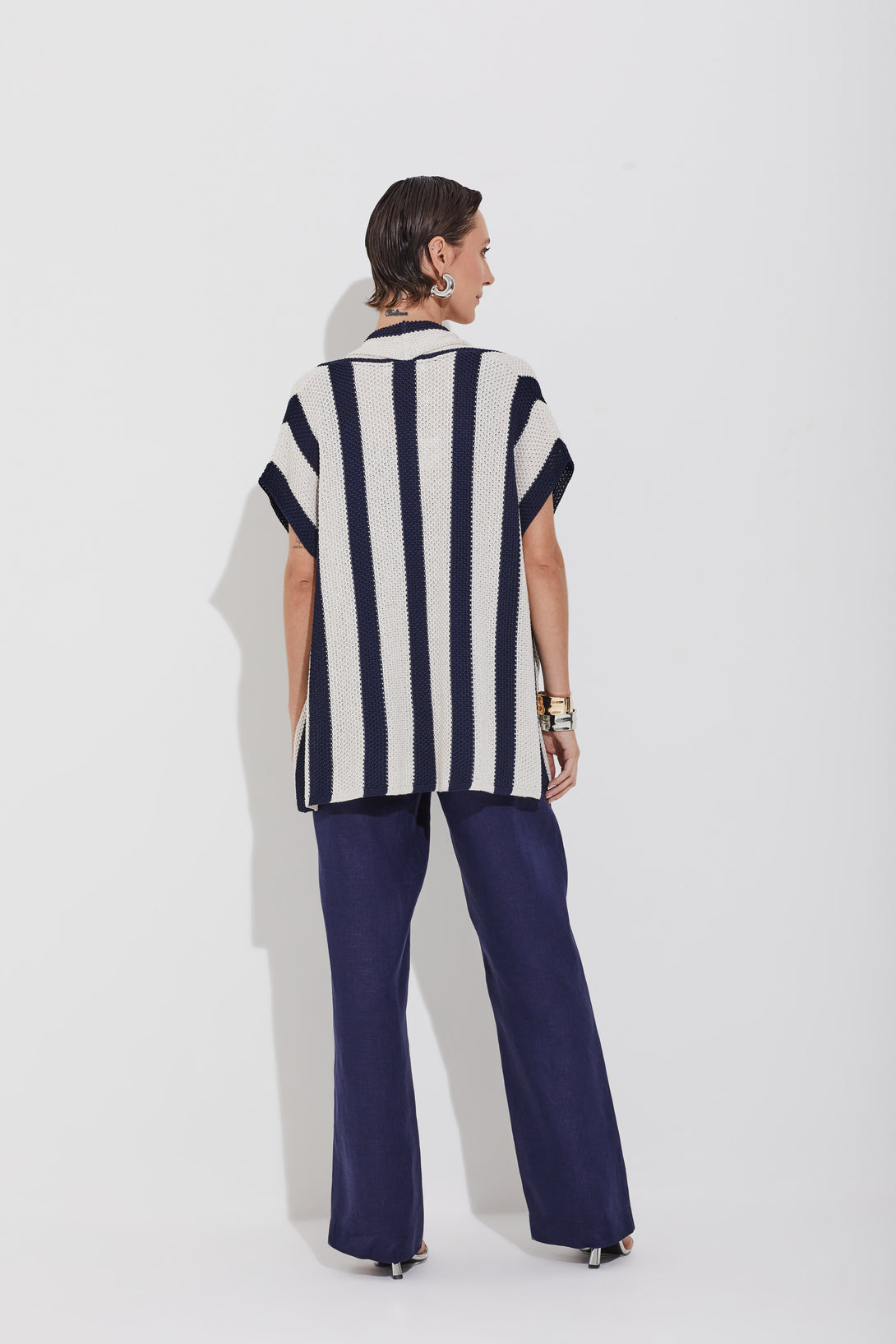 Calça de alfaiataria confeccionada em linho 100%, com cintura alta e pernas retas que valorizam a silhueta. A nervura frontal reforça o caimento elegante, enquanto os bolsos faca e o fechamento com zíper e cinco las douradas garantem funcionalidade e sofisticação. Uma peça atemporal, perfeita para composições que transitam entre o formal e o casual com estilo premium.