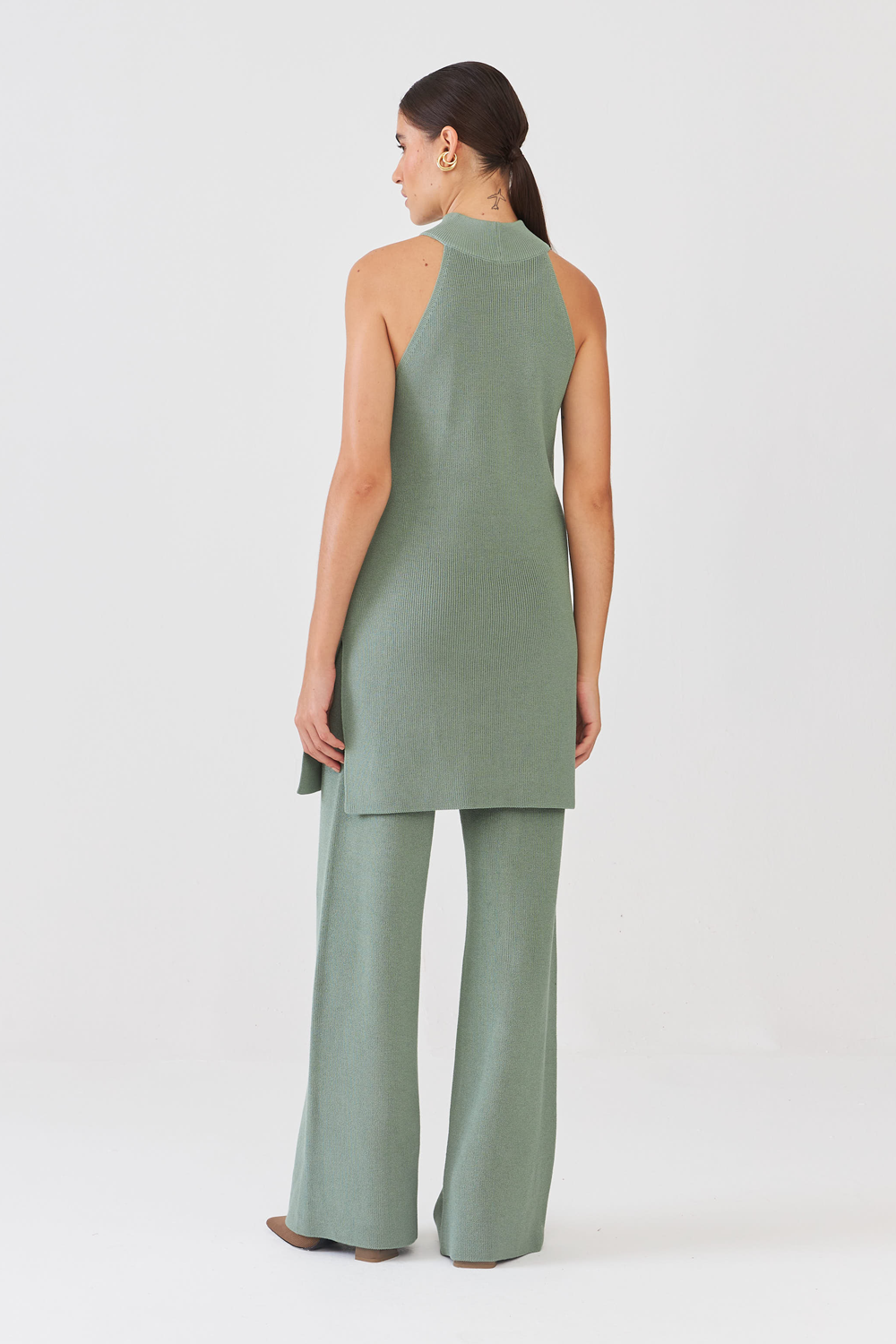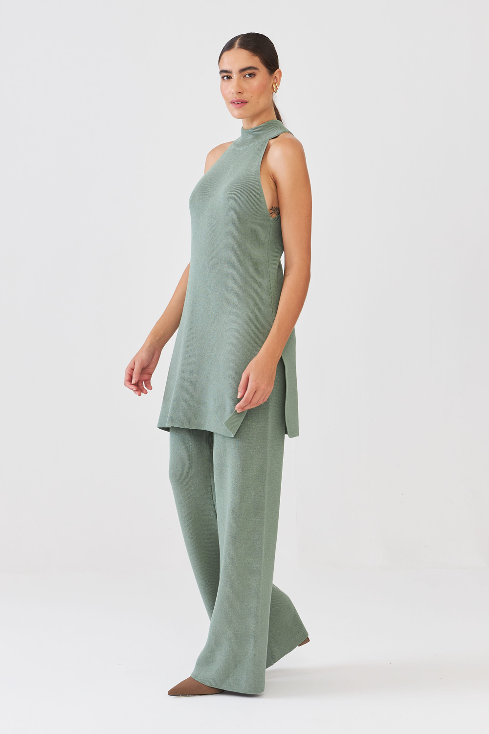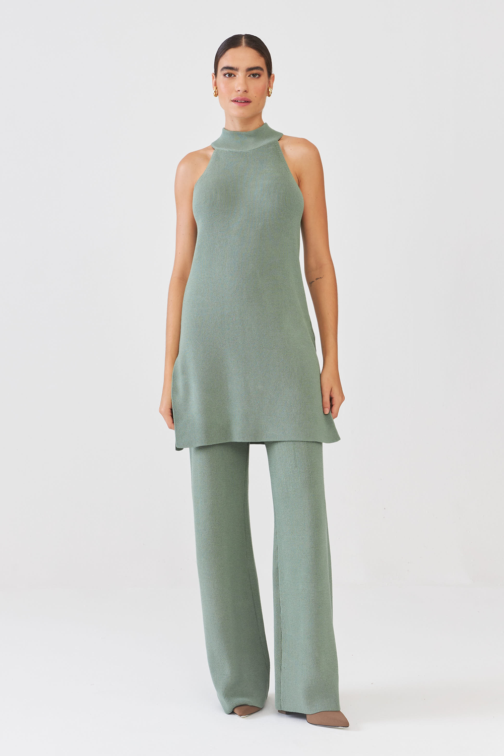 A Calça Em Tricot Canelado é feita de tricot canelado de viscose, poliamida e elastano, proporcionando conforto e textura única em seu uso. Seu estilo versátil e elegante é perfeito para diversas ocasiões, além de se ajustar perfeitamente ao corpo.