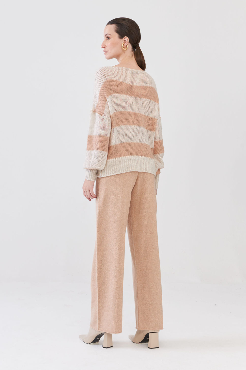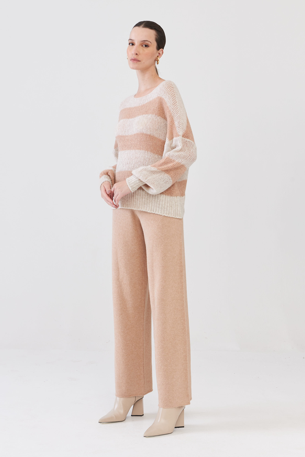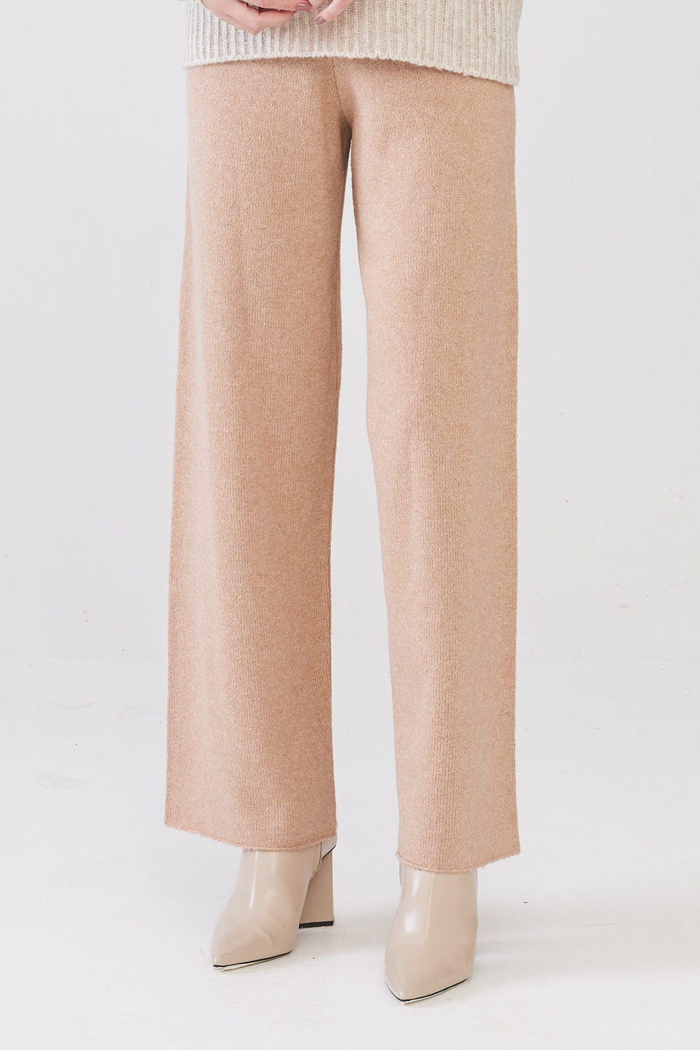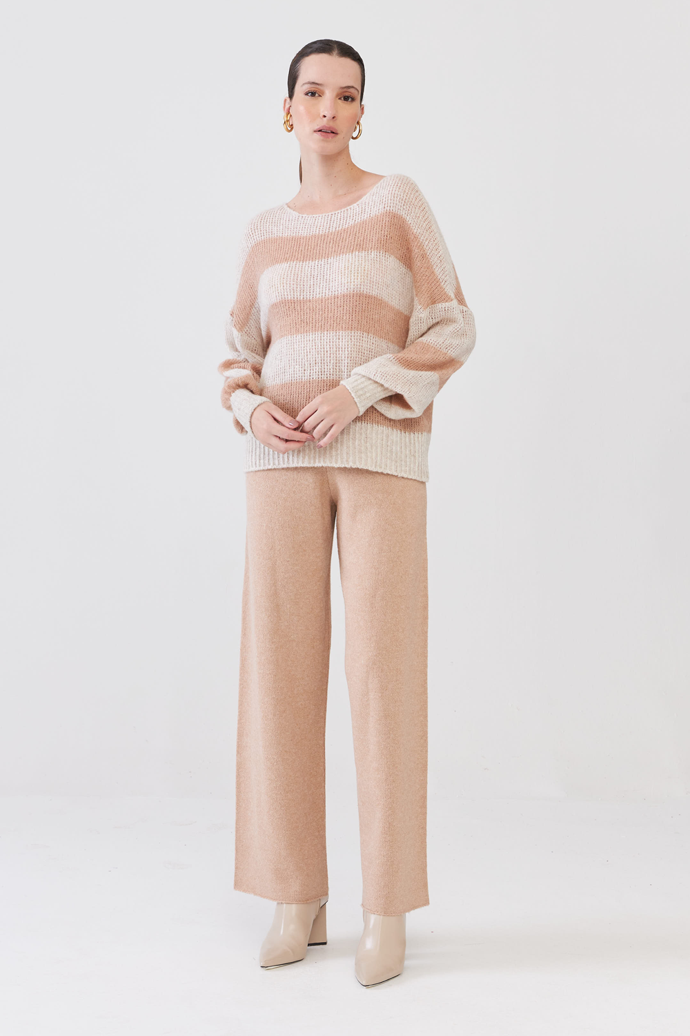 Calça Em Tricot Com Cós Canelado Bege Champagne