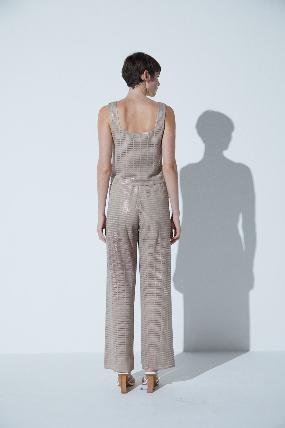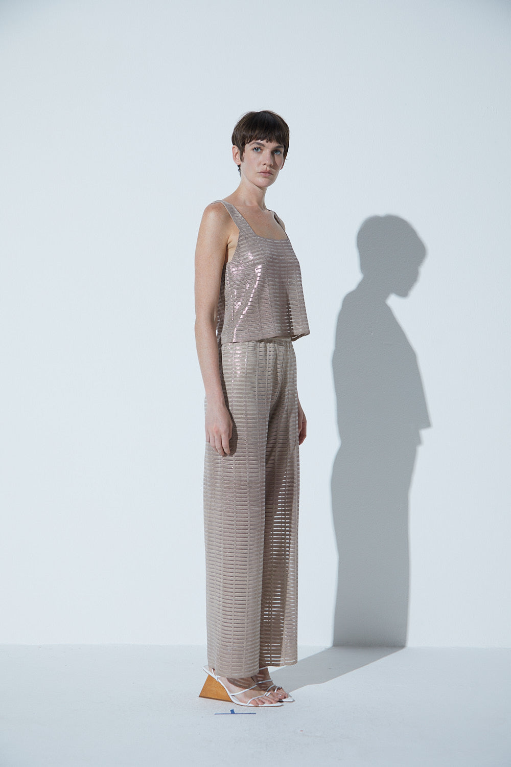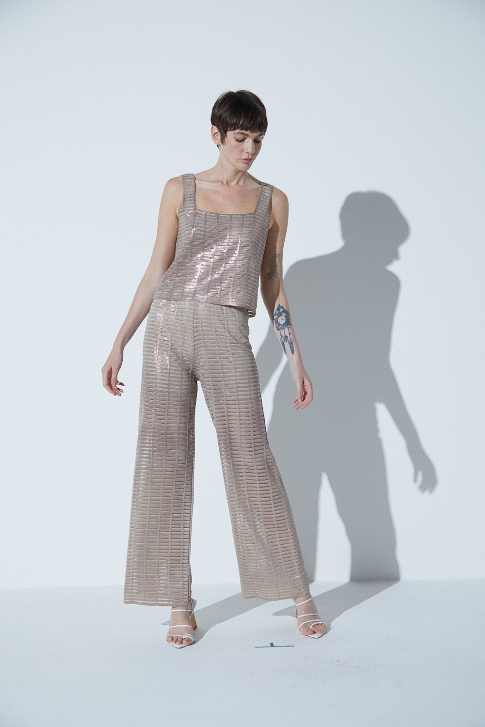 A Calça Em Tricot Com Foil Lilac feita com tricot leve e rico, possui uma leve transparência e um aplicação em foil com listras elegantes. Além disso, possui um forro interno macio que garante o máximo de conforto. Invista na composição com um toque de brilho elegante para elevar o visual das suas noites de Verão!