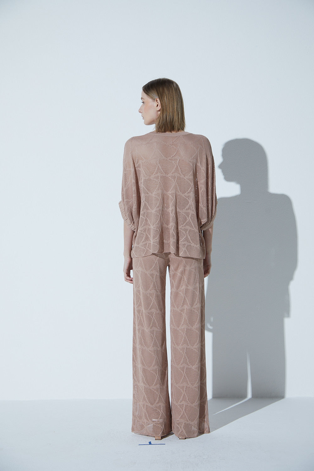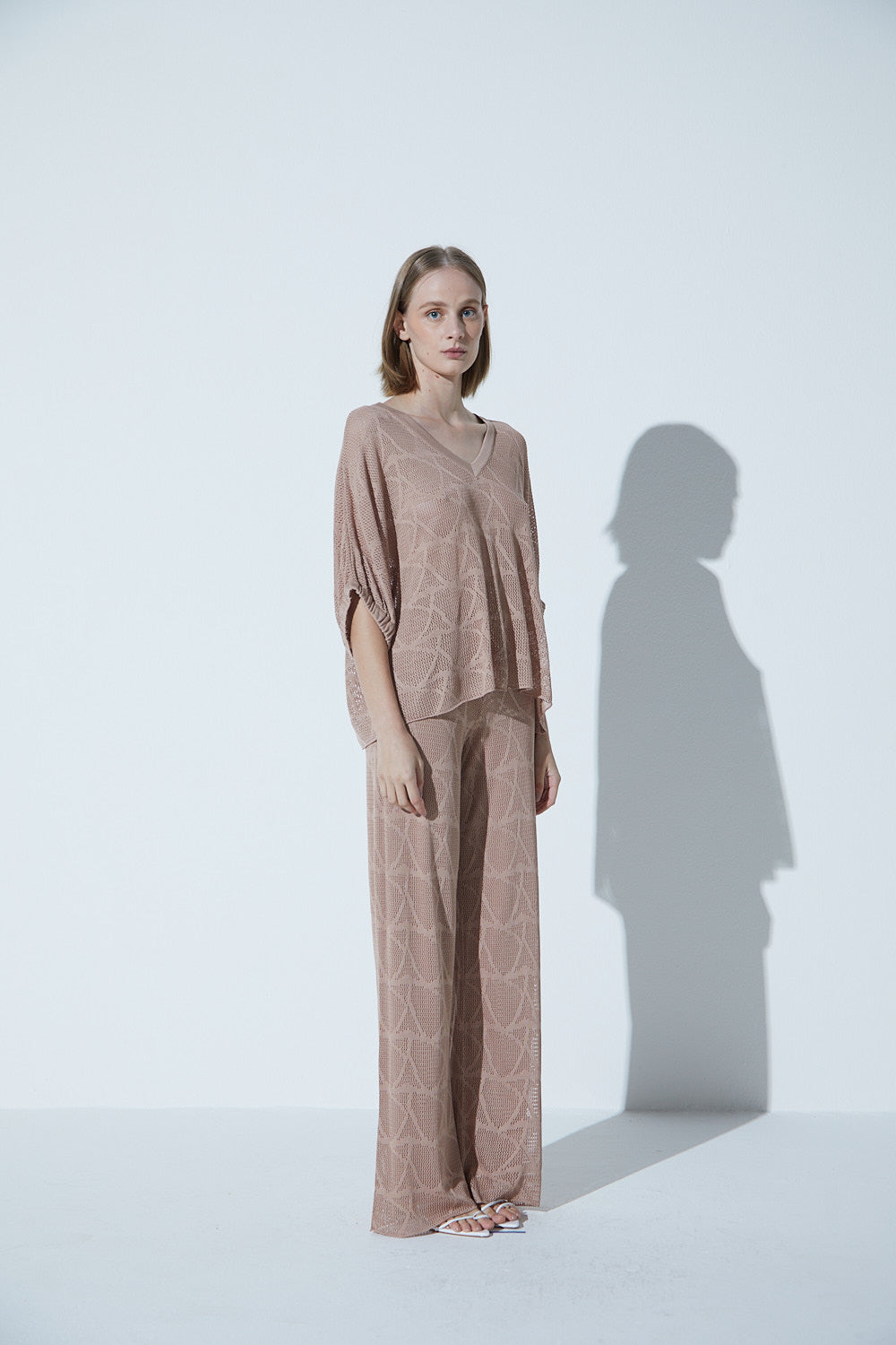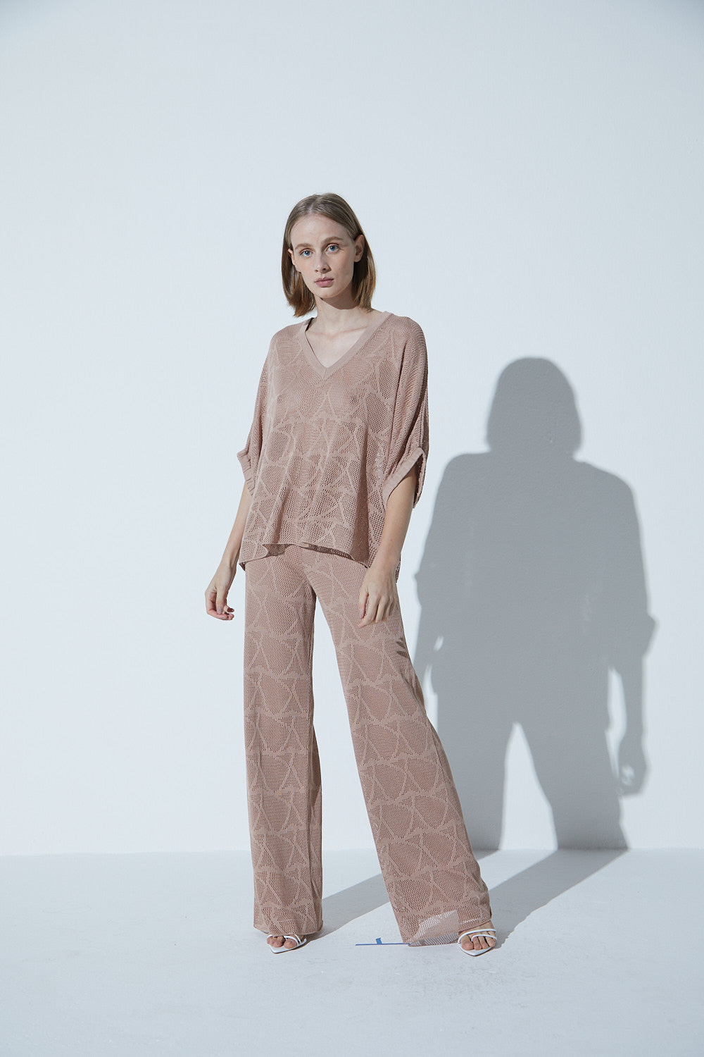 A padronagem geométrica exclusiva adiciona textura e movimento, enquanto o cós confortável com amarração garante ajuste perfeito ao corpo. Versátil, a calça pode ser usada em conjunto com o top coordenado ou combinada a peças lisas para compor looks monocromáticos ou contrastantes.
