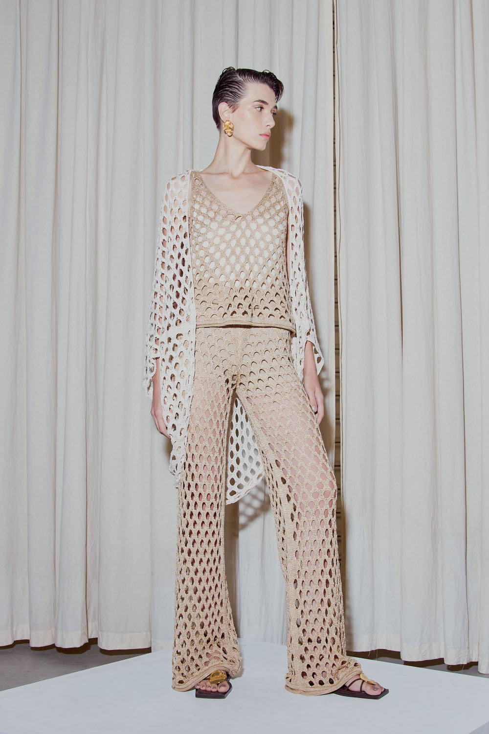 Calça Flare Maxi Furos Em Tricot Areia