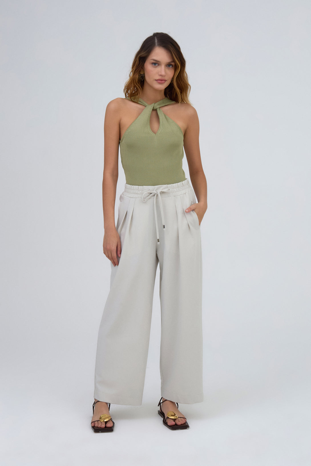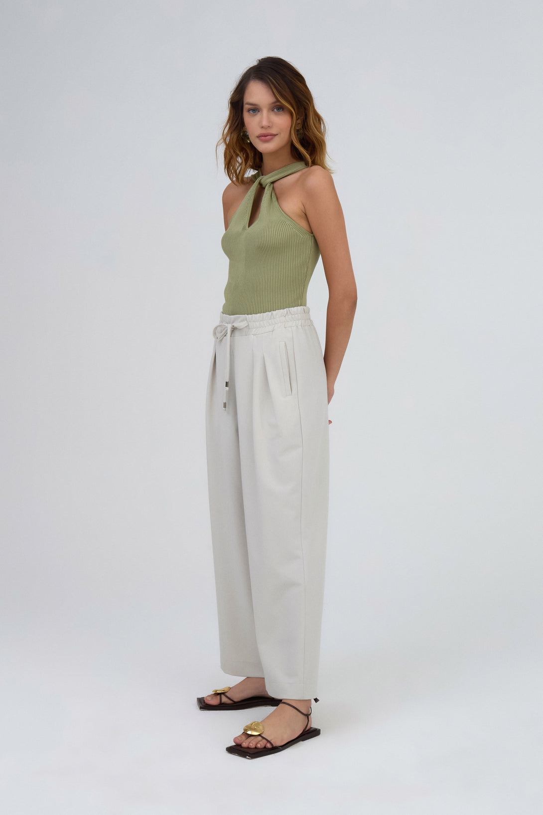 Calça Reta Com Cós De Elástico Em Tecido Marzipan
