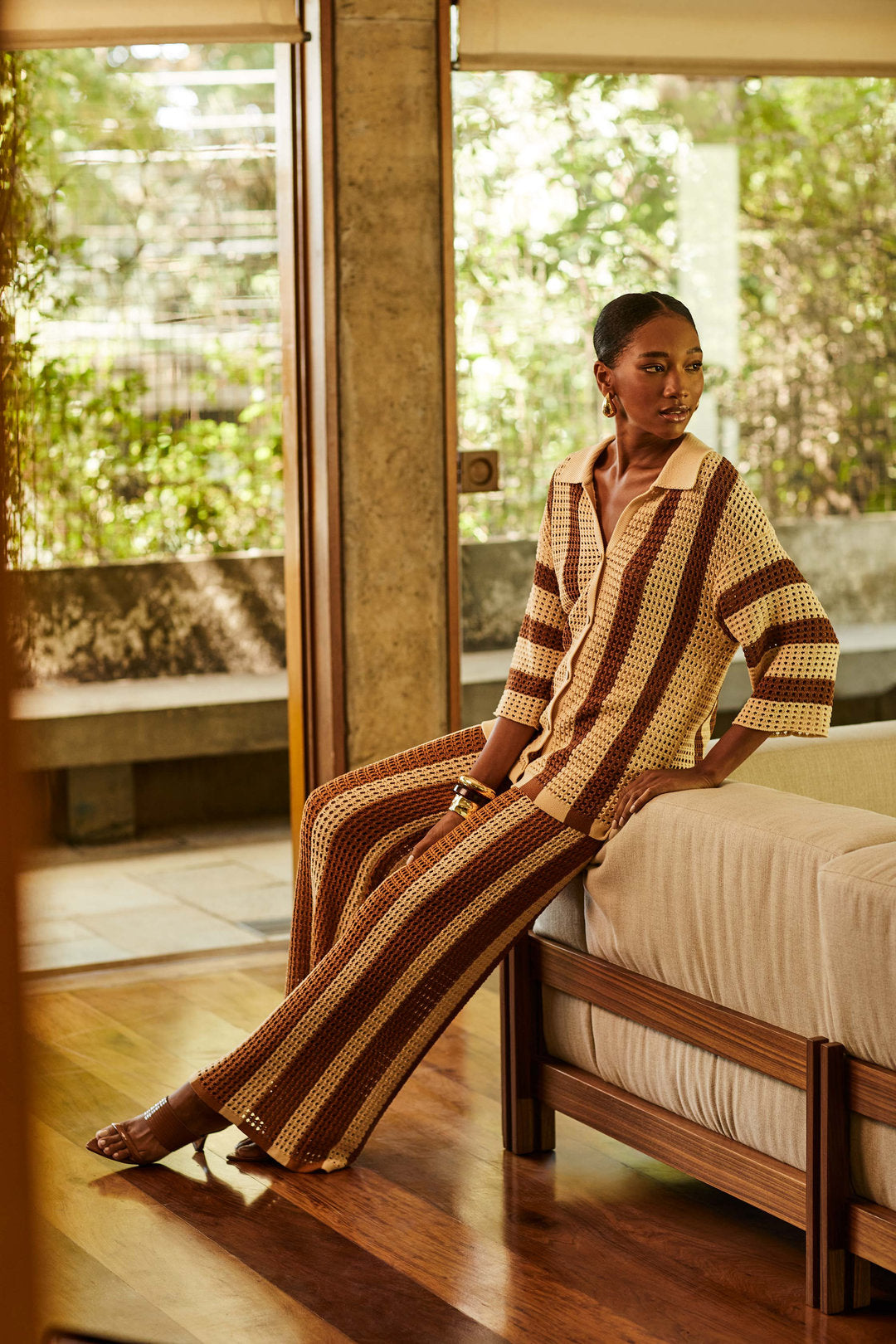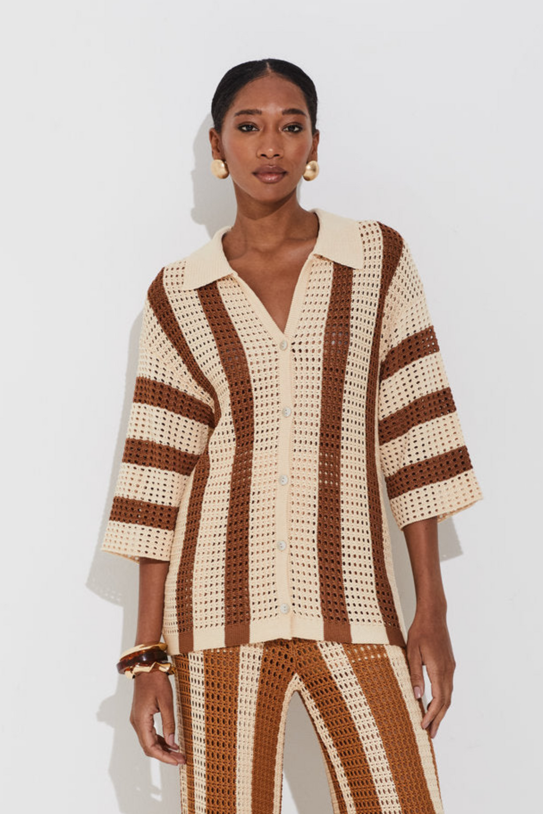 Com toque leve e macio, a peça combina frescor e sofisticação. O ponto telado com delicado vazado adiciona leve transparência, enquanto o acabamento em tricot confere um toque artesanal que valoriza os detalhes. O abotoamento frontal, gola colarinho e decote V atualizam o clássico com um ar moderno e descomplicado. As mangas curtas completam essa camisa versátil, ideal para usar sozinha ou em sobreposições elegantes.