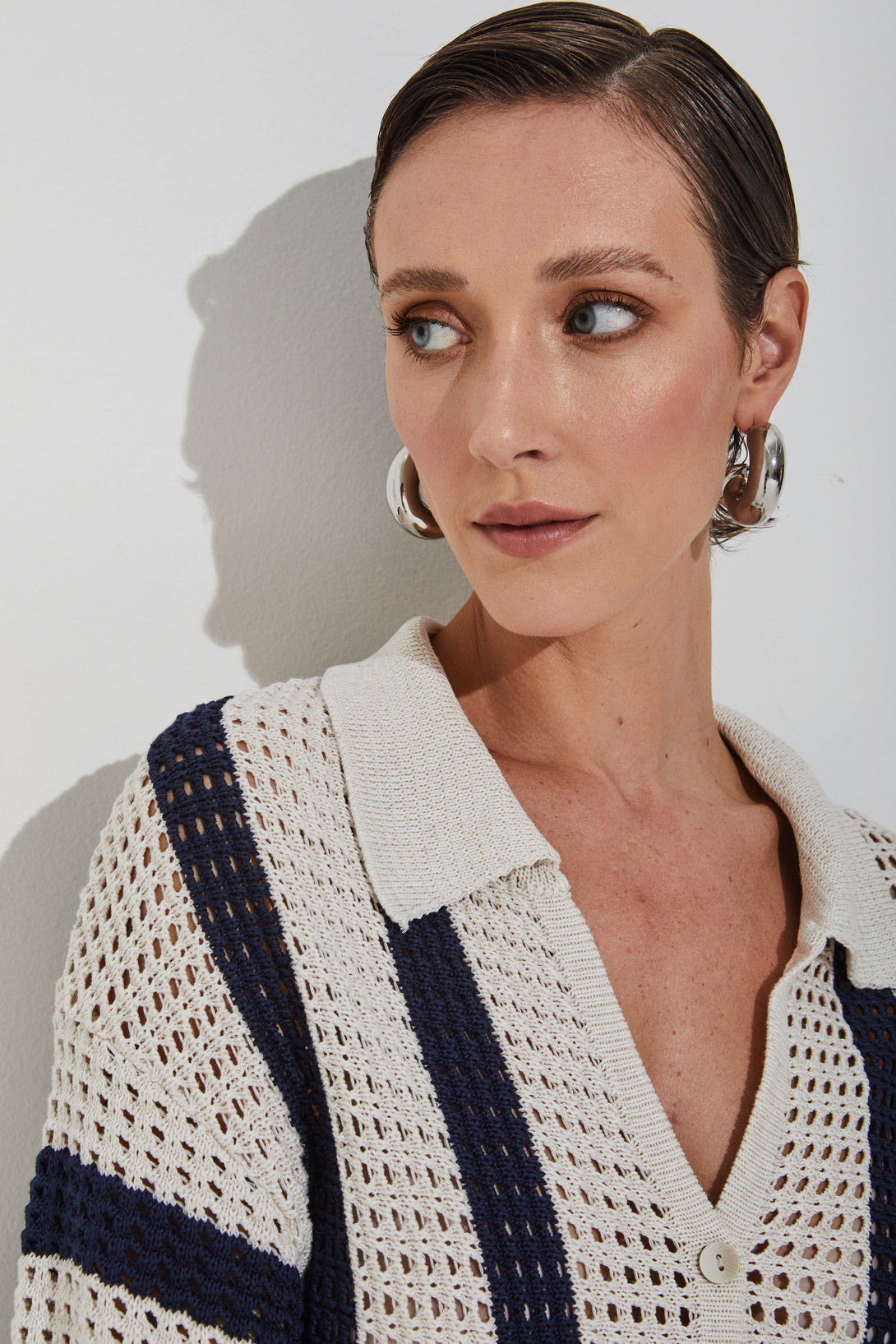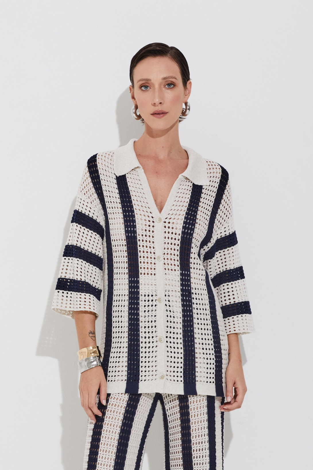 Com toque leve e macio, a peça combina frescor e sofisticação. O ponto telado com delicado vazado adiciona leve transparência, enquanto o acabamento em tricot confere um toque artesanal que valoriza os detalhes. O abotoamento frontal, gola colarinho e decote V atualizam o clássico com um ar moderno e descomplicado. As mangas curtas completam essa camisa versátil, ideal para usar sozinha ou em sobreposições elegantes.