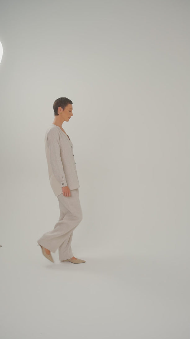 O cardigan alongado combina elegância natural e design contemporâneo em um mix refinado de materiais. A frente em linho 100% com fechamento por botões metálicos  confere uma leitura clássica e precisa, enquanto as mangas longas, também com fechamento em botão, adicionam um detalhe sutil ao visual. As costas em tricot encerado, no mesmo tom da peça, criam um contraste delicado de texturas, enriquecendo o design. Com decote V, pode ser usado sozinho ou como sobreposição, acompanhando diferentes momentos com versatilidade e sofisticação.