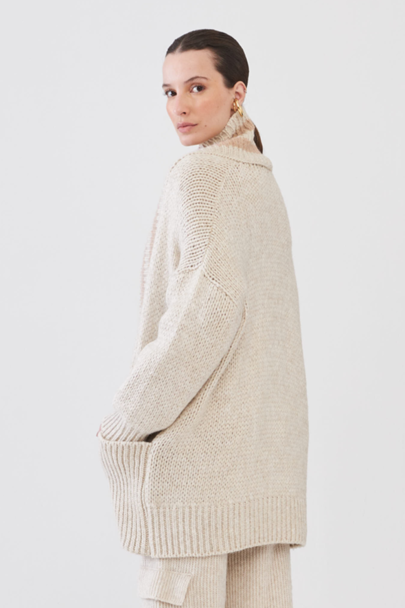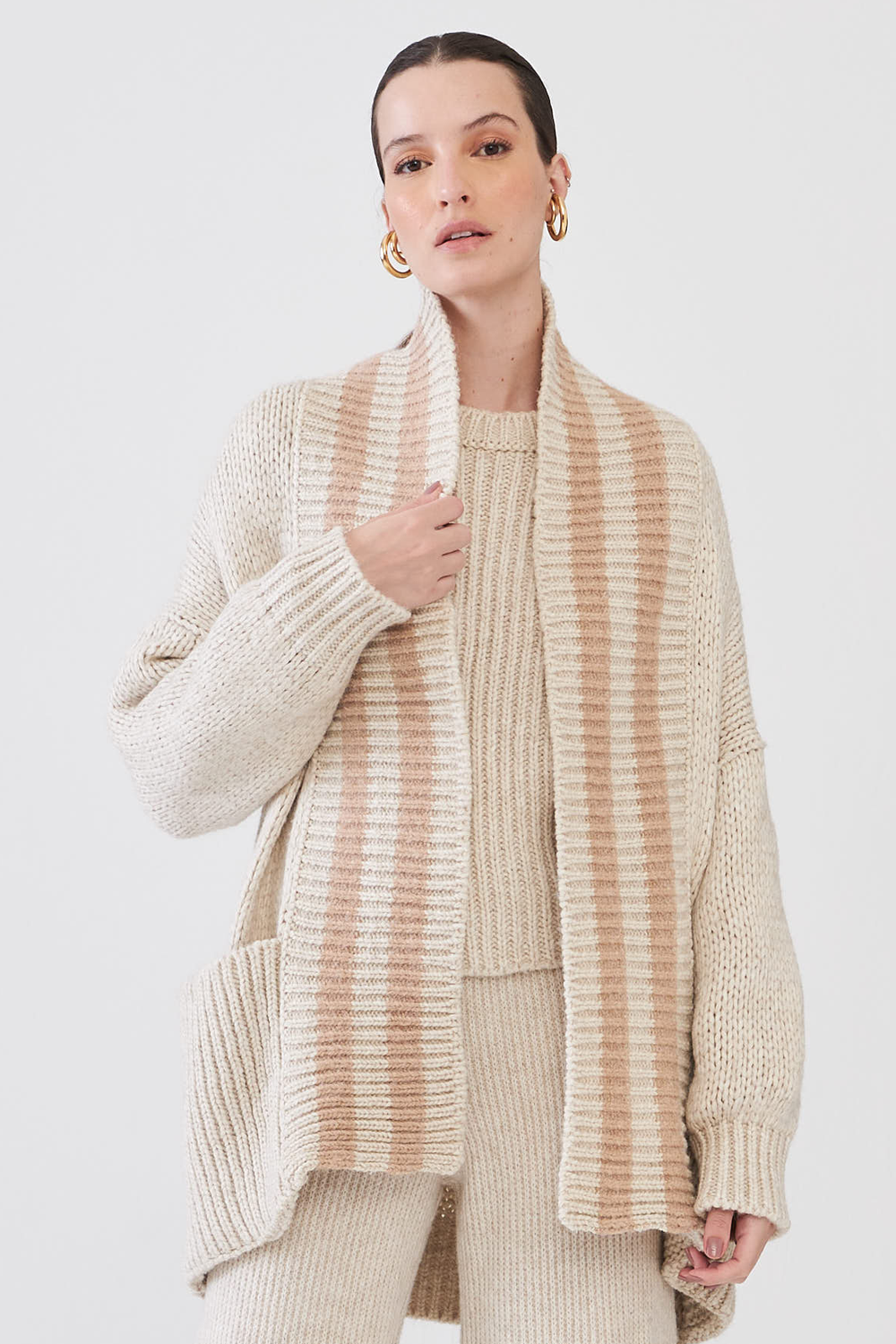 Este cardigan em tricot com listras é ideal para o dia-a-dia! Seu shape alongado permite maior conforto ao vestir e possui bolsos aplicados para maior praticidade. Com acabamento em papiro e preto, é uma peça comfy e versátil para todas as ocasiões. Adquira já o seu!