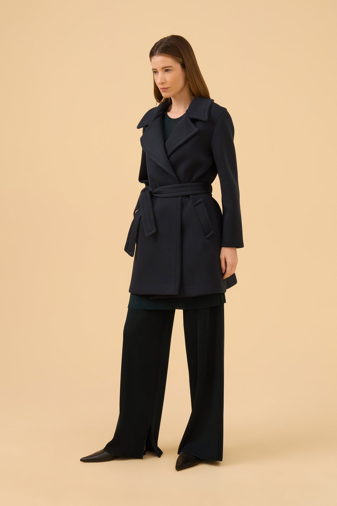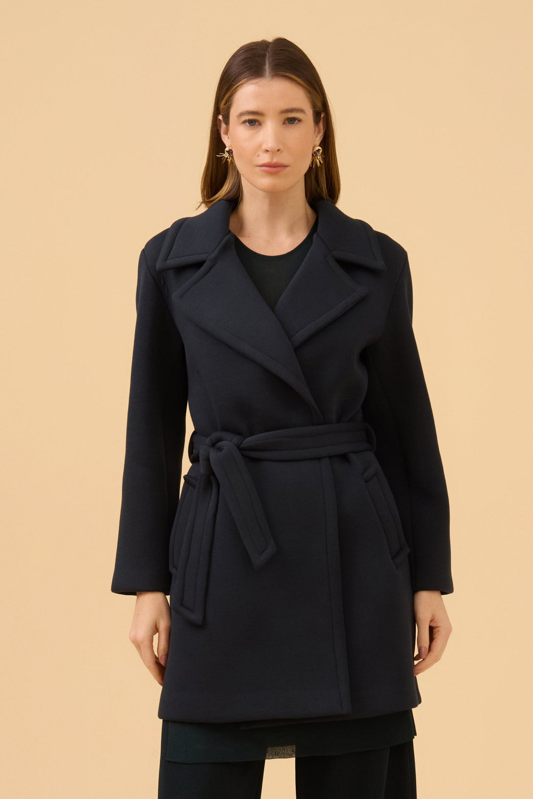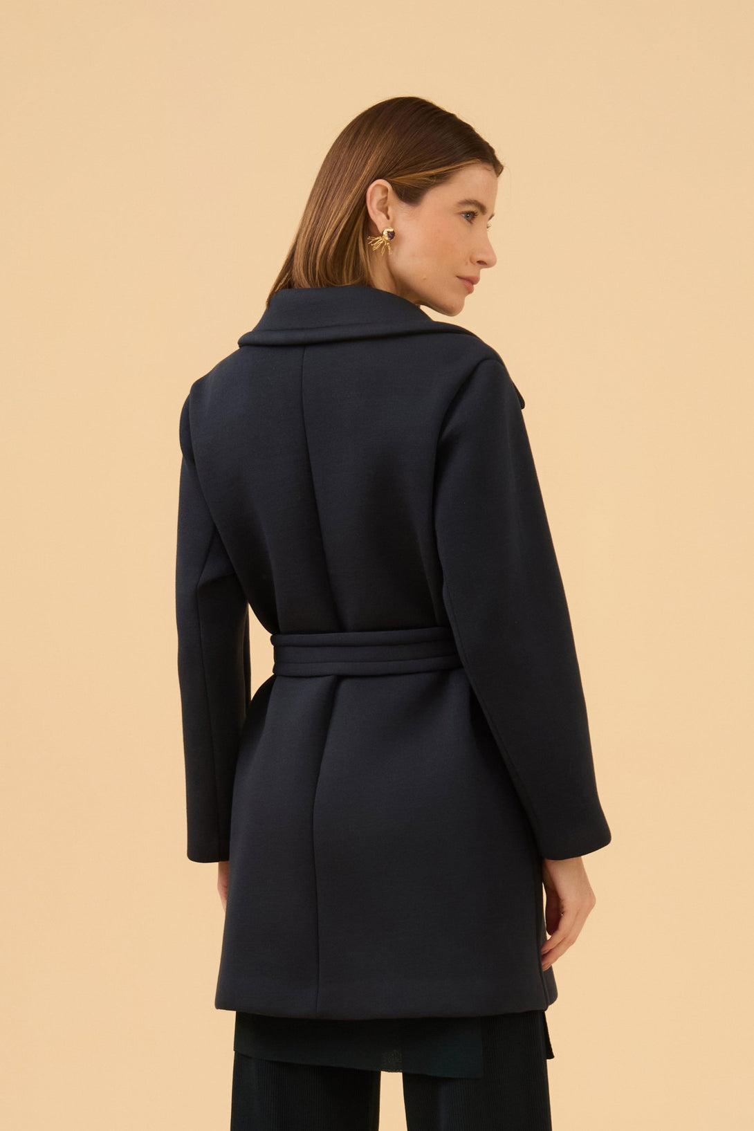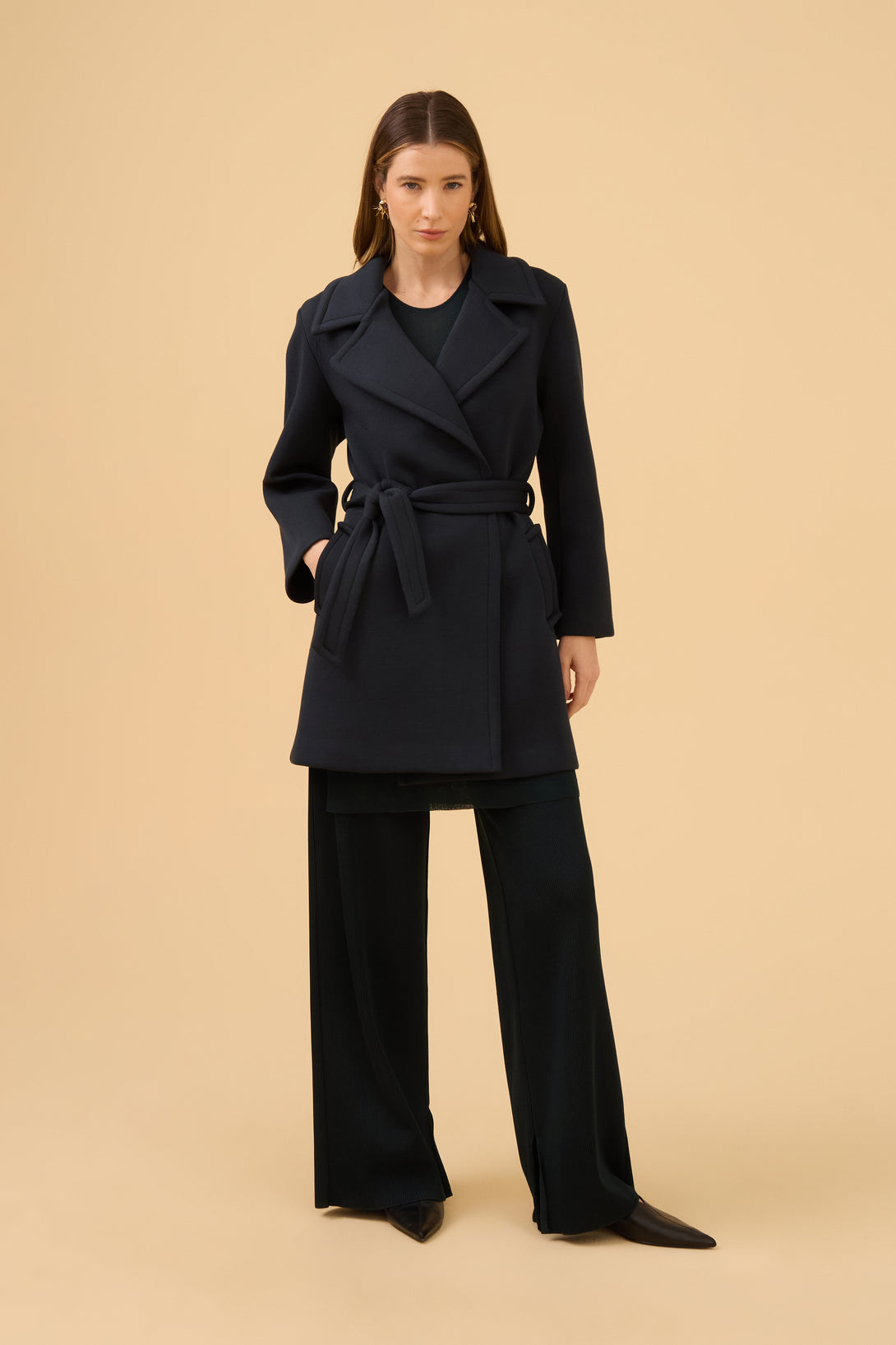 O Casaco Dublado com Faixa é uma peça elegante e quentinha, com um design clássico. A faixa na cintura adiciona um toque de sofisticação, valorizando a silhueta. Ideal para os dias mais frios.