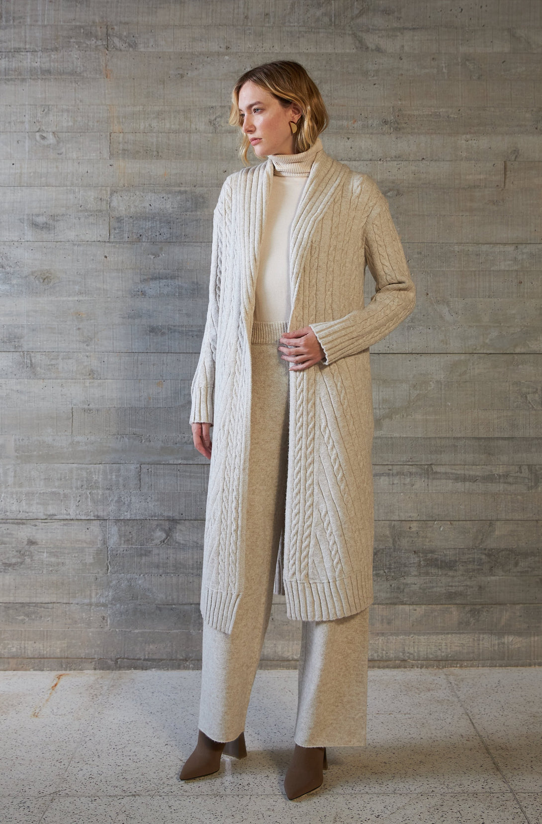 Este casaco longo de tricot Aran é feito com uma trama tradicional com efeito trançado,  u clássico de invernp, perfeito para te manter aquecida nos dias mais frios. Com o seu design clássico e atemporal, este casaco traz conforto e elegância em qualquer look. A peça possui comprimento e mangas longas que valorizam a silhueta quando usados como sobreposição em uma produção monocromática. Invista!