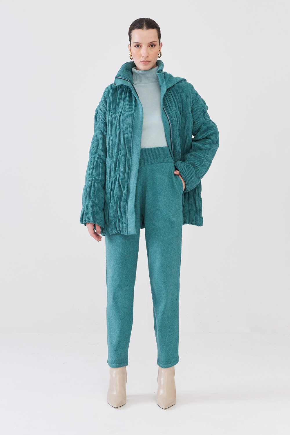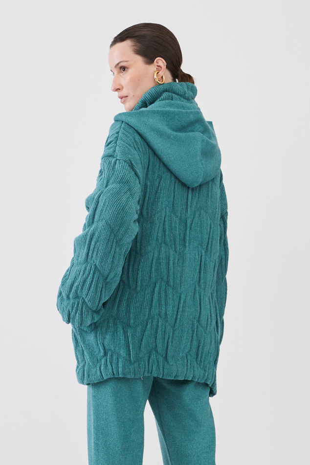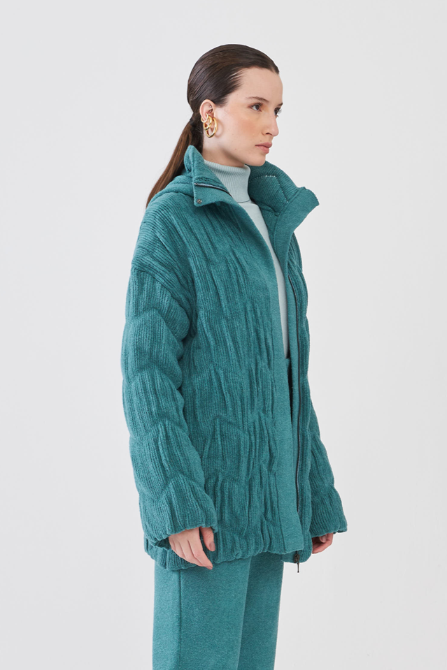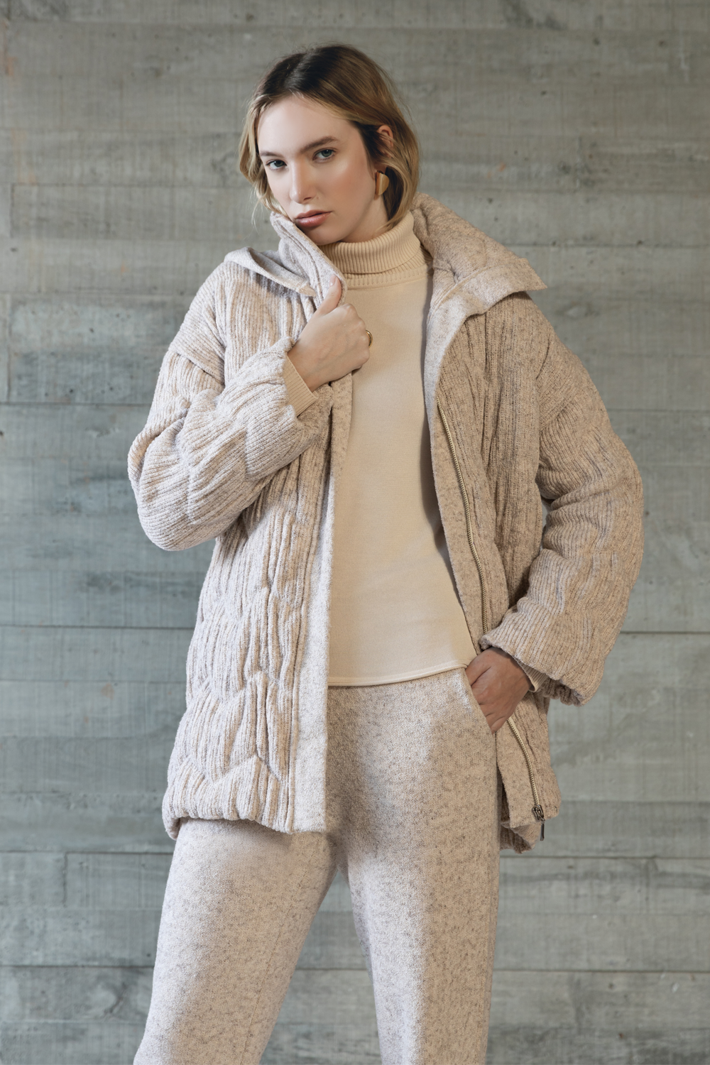 O casaco puffer em tricot é tudo o que você precisa para o inverno! Confortável e moderno, possui fechamento por zíper e um gorro que mantém você protegida do frio. Seu acabamento matelassê é diferencial garante um toque de personalidade à peça. Invista!