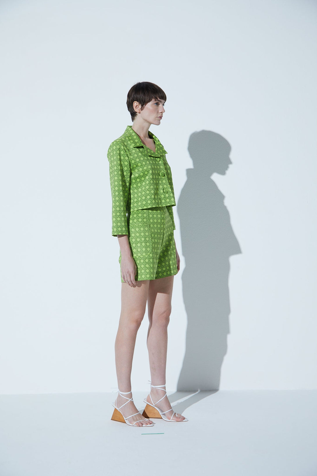 O clássico casaco spencer ganha novos ares confeccionado em malha neoprene com um toque de alfaiataria. A malha estruturada traz mais conforto e praticidade à peça! A técnica da estamparia digital traz a essência do verão e arte brasileiros inspirada na arte da cestaria. Aposte na composição com a calça 190910 para o seu visual sofisticado e tropical.