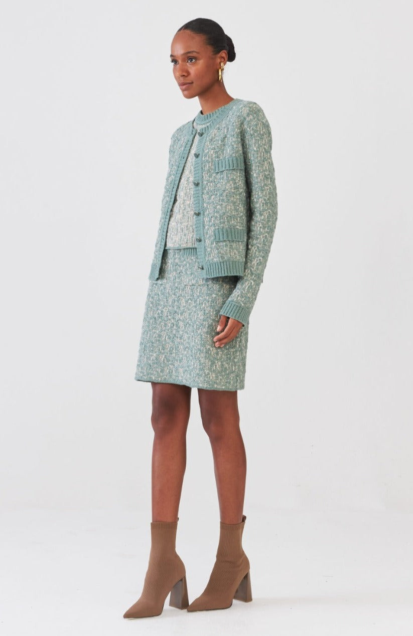 Um casaqueto em tricot tweed confeccionado com um mix de fios e trabalhado com mix de pontos que formam o tweed exclusivo Viviane Furrier. A combinação destes materiais proporciona uma textura única e um toque de brilho sutil, conferindo elegância à peça!
