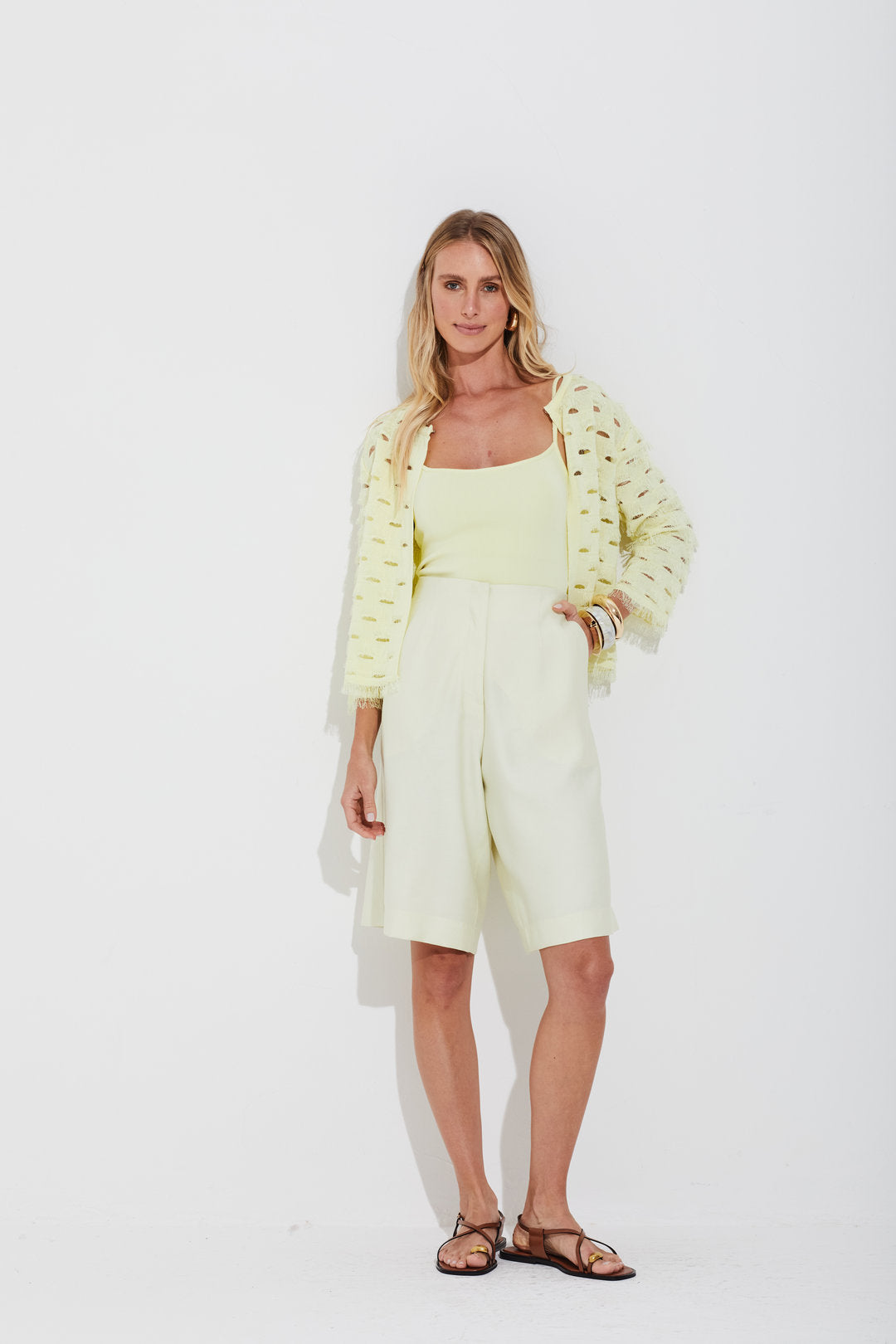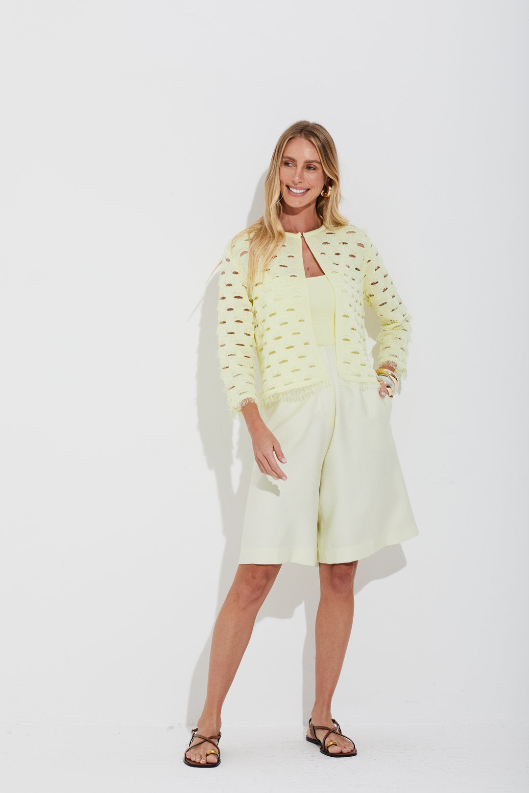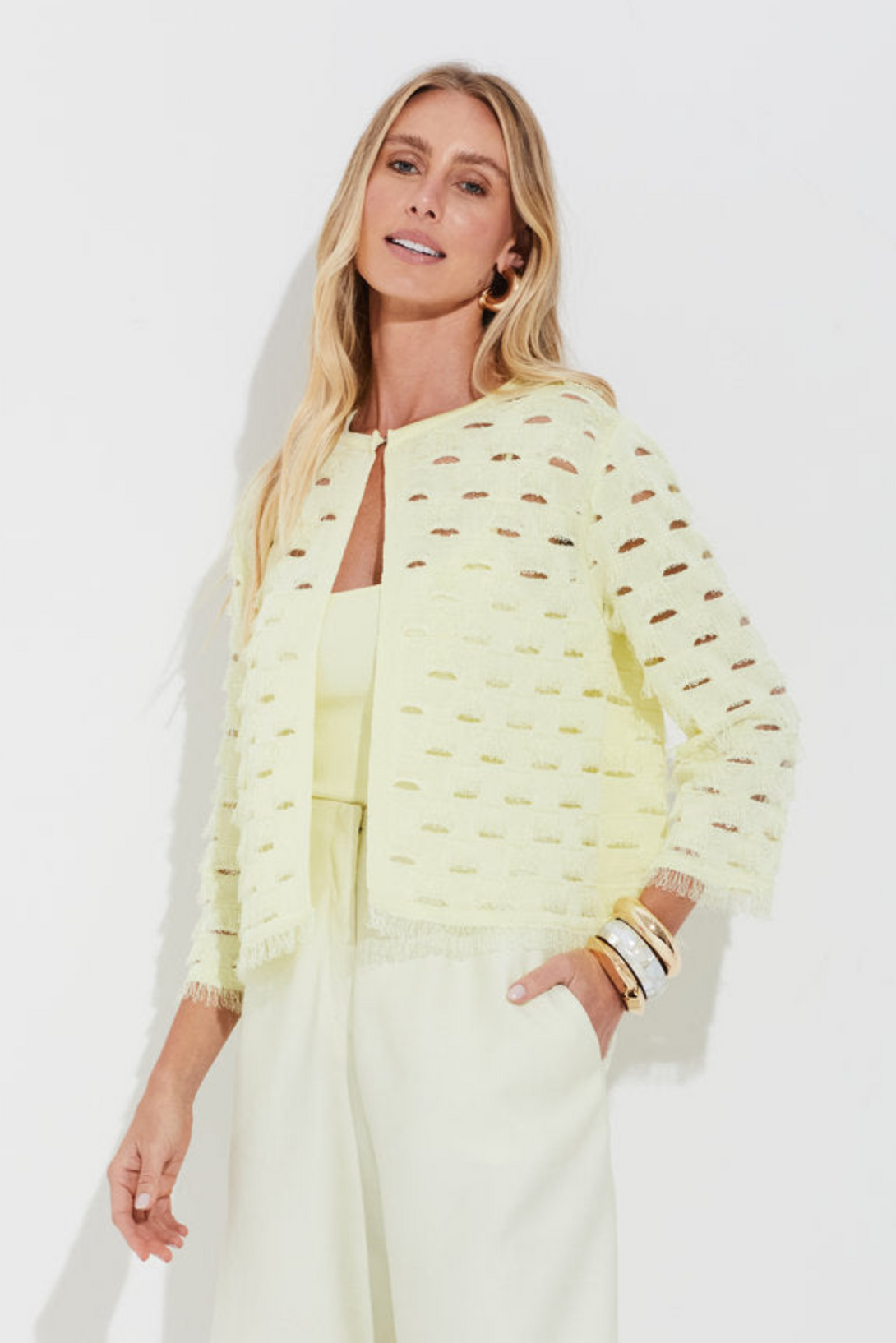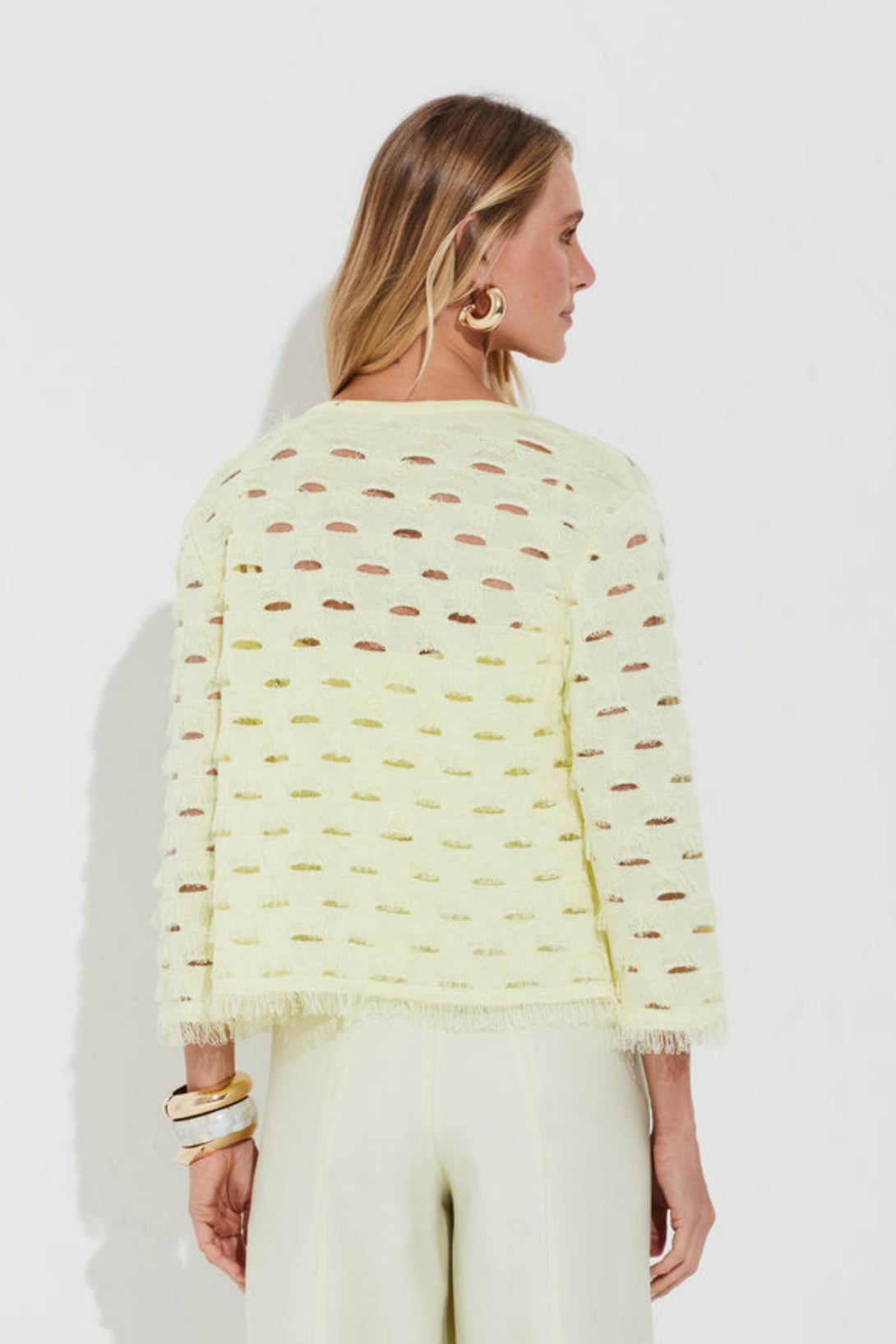 Casaqueto em tricot com detalhes geométricos vazados que trazem transparência sutil. Gola redonda com fechamento em gancho, abertura frontal, mangas 7/8 e comprimento regular. Acabamento com franjas delicadas na barra e nos punhos.