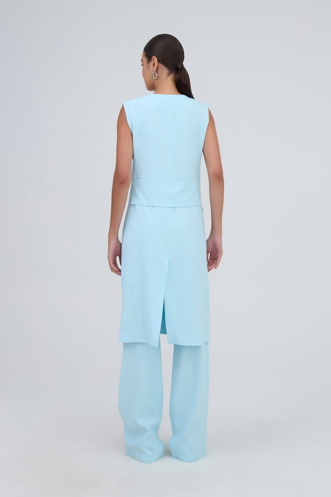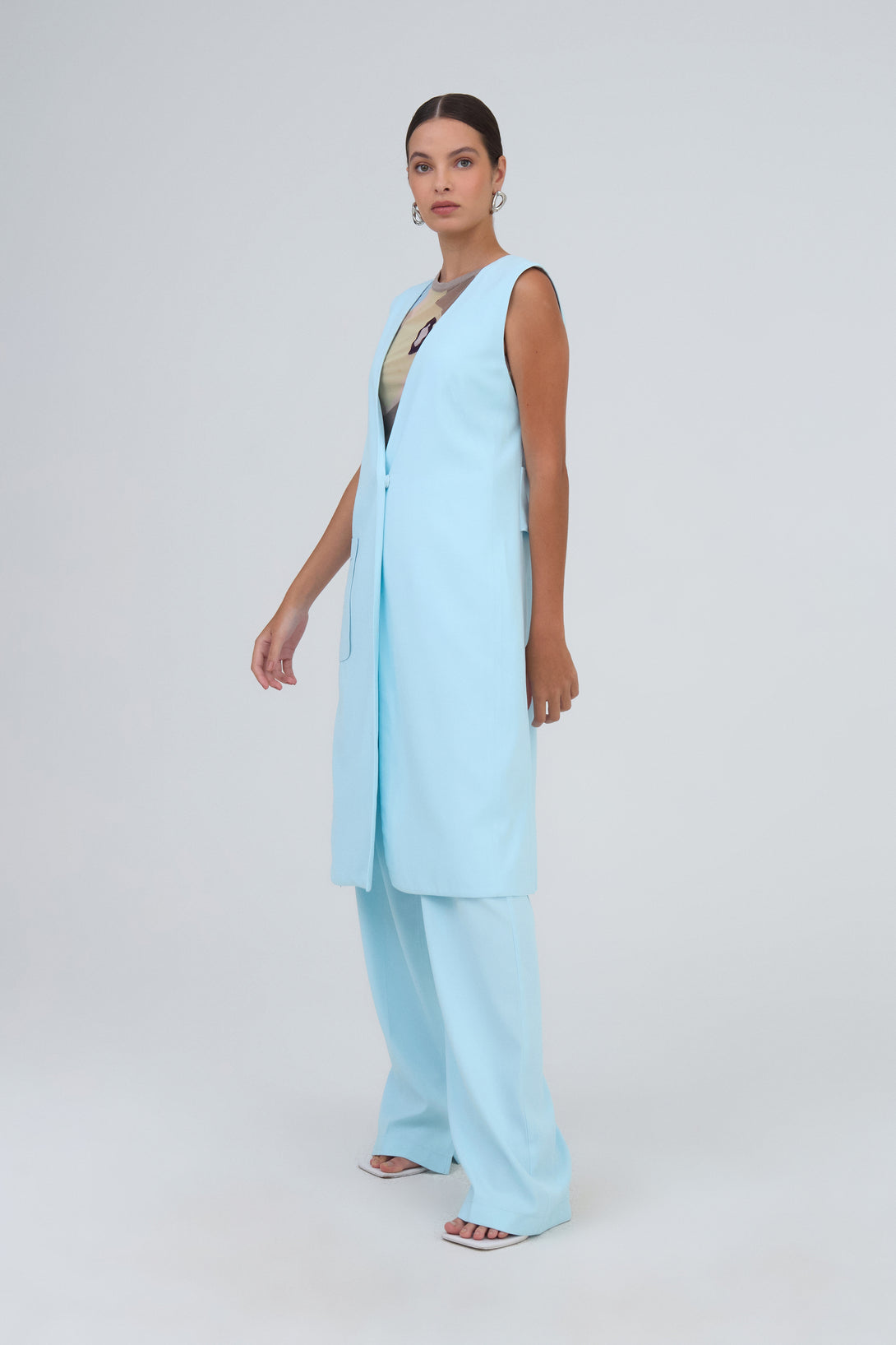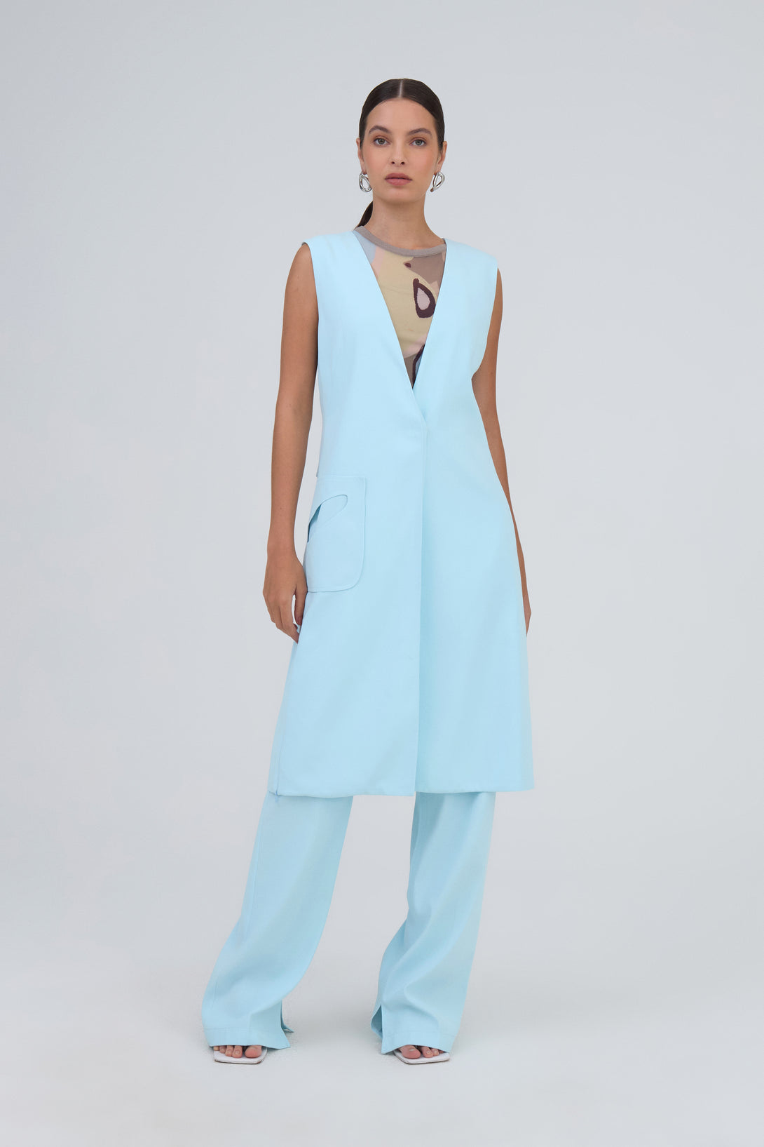 O Colete em Tecido é uma peça de alfaiataria elaborada. Com bolsos e fendas laterais, ele forma um conjunto monocromático com a calça, garantindo um visual elegante e harmonioso.