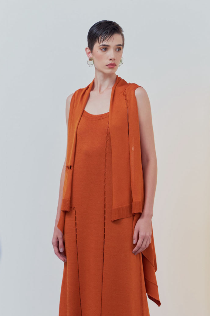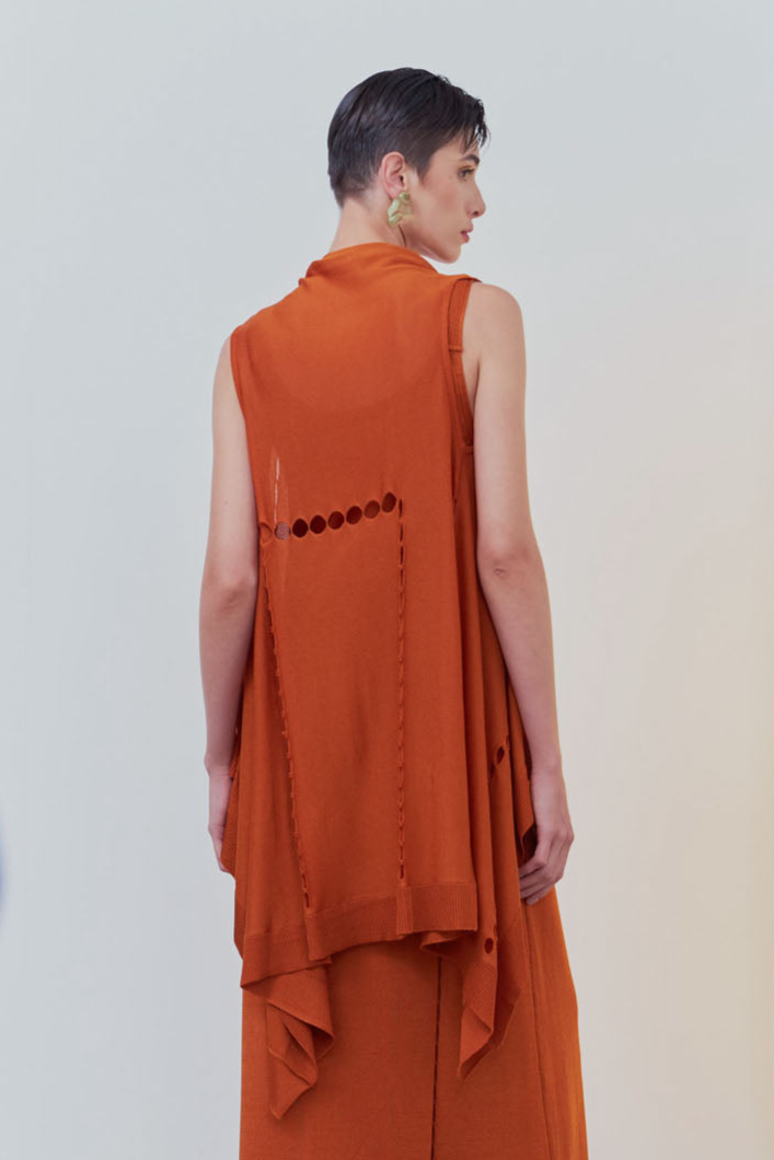 Este colete possui um visual leve e delicado, destacando-se pelos belos detalhes em furos que formam linhas geométricas, proporcionando um charme único à peça.
