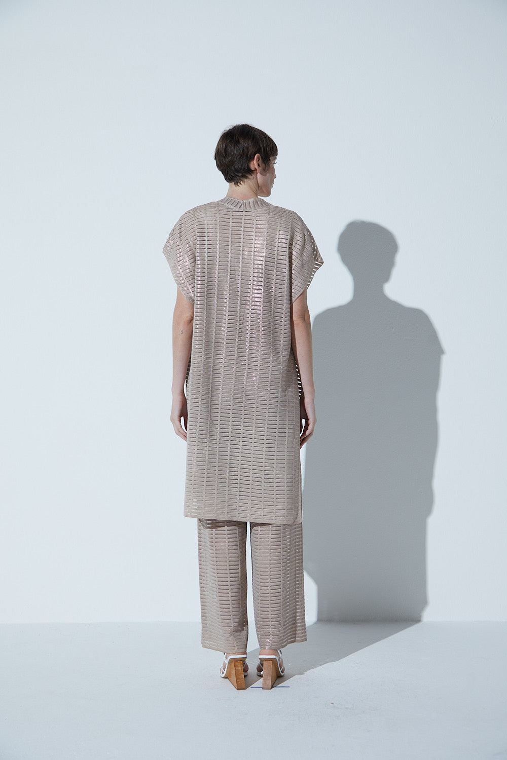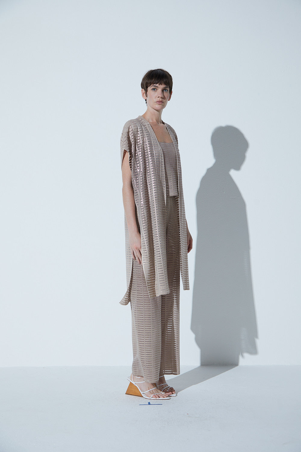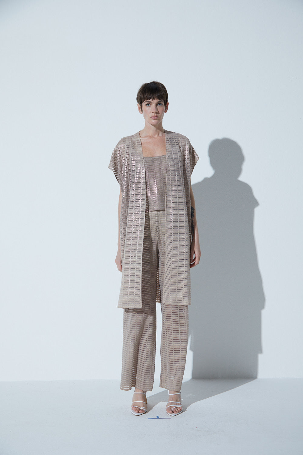 O Colete Em Tricot Com Foil Lilac é confeccionado com técnica de listras com fios de lurex. A aplicação do foil aumenta o brilho e leveza para um look rico e ideal para sair à noite durante os dias de verão.