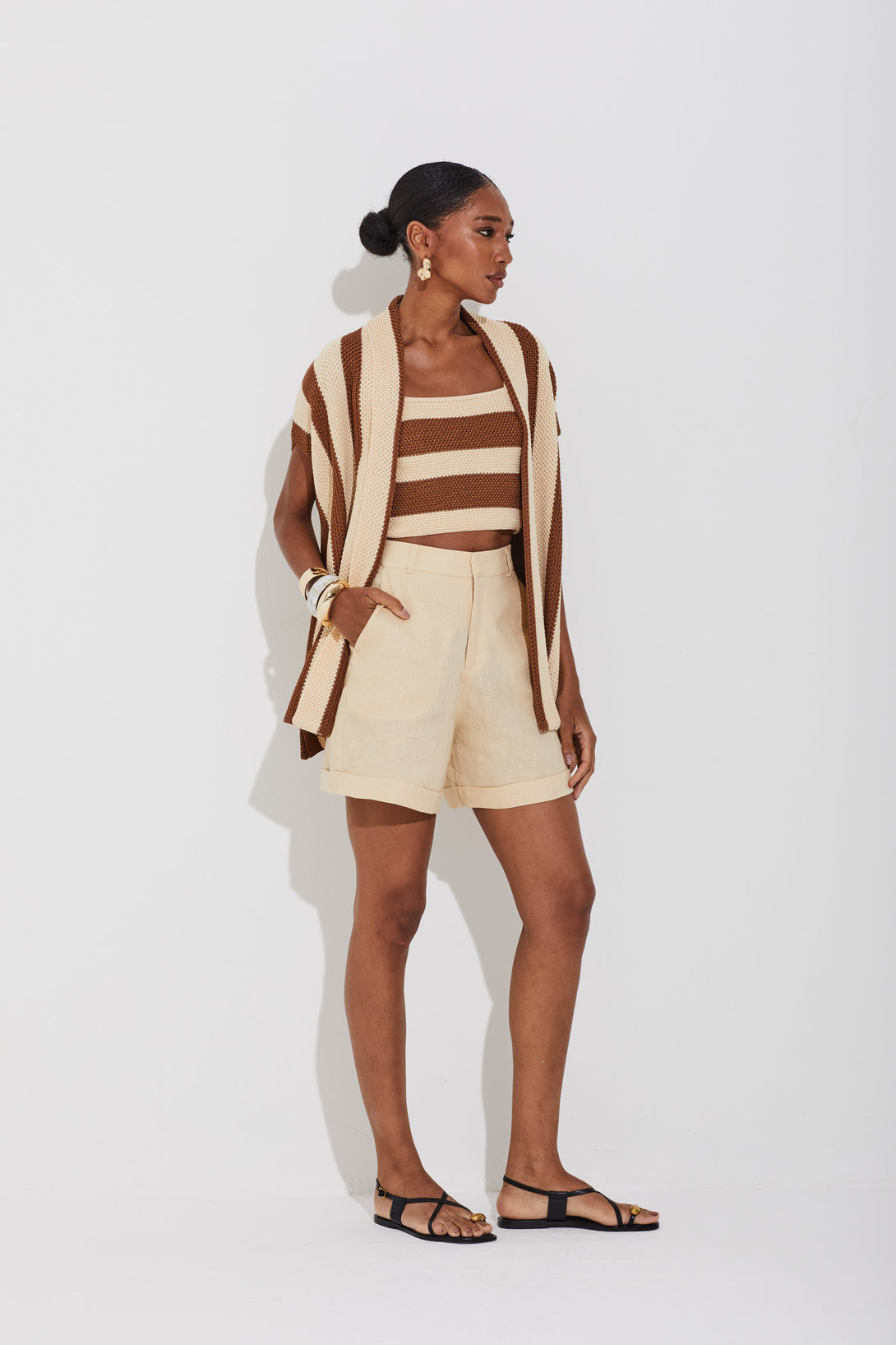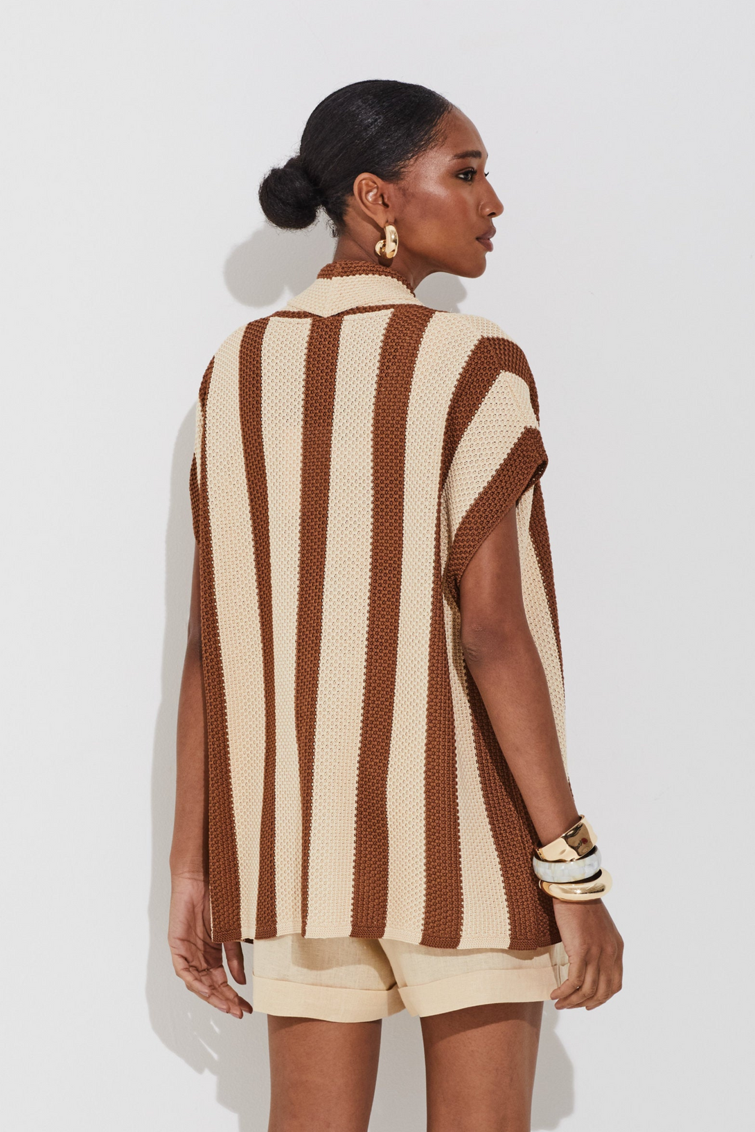 Colete amplo em tricot com toque rústico e listras verticais que alongam a silhueta. Sem mangas, com modelagem ampla e comprimento alongado, oferece conforto e estilo. A abertura frontal facilita o uso e permite diversas combinações, tornando-se peça versátil para inumeras sobreposições.